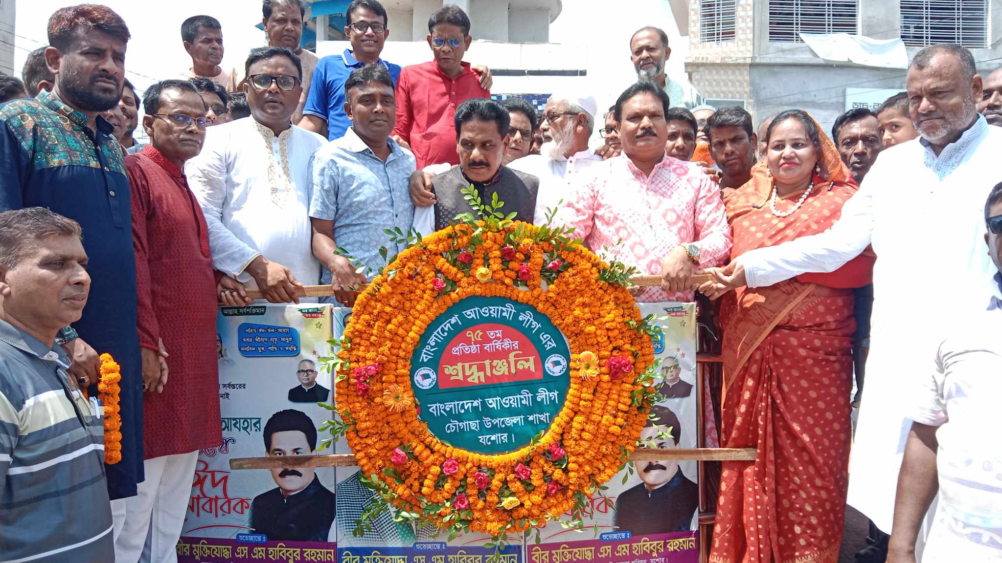 যশোরের চৌগাছায় আওয়ামীলীগের ৭৫তম প্রতিষ্ঠাবার্ষিকী পালিত হয়েছে । এ উপলক্ষে রবিবার (২৩ জুন) উপজেলা আওয়ামী লীগের আয়োজনে জাতীয়, দলীয় পতাকা উত্তোলন, জাতির পিতা বঙ্গবন্ধু শেখ মুজিবুর রহমানের ম্যুরাল ও বঙ্গবন্ধুর প্রতিকৃতিতে পুস্পমাল্য অর্পন করা হয়।