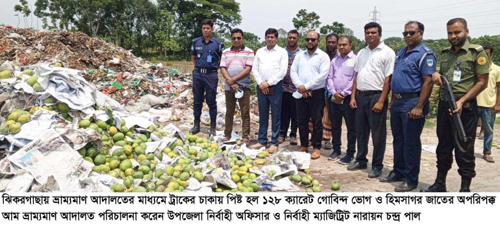 থানা পুলিশ সূত্রে জানা যায়, বুধবার রাত সাড়ে ১২টার সময় গোপন সংবাদের উপর ভিত্তি করে যশোর-বেনাপোল মহাসড়কের ঝিকরগাছা ব্রীজের নিকটে শার্শা উপজেলার বেলতলা থেকে রাজধানী (ঢাকা)গামী ঢাকা মেট্রো ১১-৮৪৮৬নং এর একটি মিনি ট্রাকে ১২৮ ক্যারেট বিষাক্ত কেমিক্যাল ব্যবহার করা আম আটক করেন। প্রতিটি ক্যারেটে ২০ কেজি করে সর্বমোট ২হাজার ৫শত ৬ কেজি অপরিপক্ক আম পাওয়া যায়। পরবর্তীতে উপজেলা নির্বাহী অফিসার ও নির্বাহী ম্যাজিট্রিটকে অবগত করা হলে নির্ধারিত সময়ের পূর্বে বিষাক্ত কেমিক্যাল ব্যবহার করা আম দুপুর ১টার সময় কৃর্তিপুর সংলগ্ন পৌরসভার ময়লা ফেলার স্থানে নিয়ে ভ্রাম্যমান আদালতের মাধ্যমে ট্রাকের চাকায় পিষ্ট করে অপরিপক্ক আম গুলো বিনষ্ট করা হয়। এঘটানার পরে আমের সাথে আটক মিনি ট্রাকের ড্রাইভার ও হেলপারের নিকট হতে মুচলেকা নিয়ে ছেড়ে দেওয়া হয়েছে। এসময় উপস্থিত ছিলেন, উপজেলা নির্বাহী অফিসার ও নির্বাহী ম্যাজিট্রিট নারায়ন চন্দ্র পাল, থানার অফিসার ইনচার্জ কামাল হোসেন ভূঁইয়া, উপজেলা কৃষি অফিসার কৃষিবিদ মাসুদ হোসেন পলাশ, থানার সেকেন্ড অফিসার এসআই মোকলেছুজ্জামান, ঝিকরগাছা রিপোর্টার্স ক্লাবের সাধারণ সম্পাদক আফজাল হোসেন চাঁদ, সিনিয়র সহ সভাপতি মহাসিন আলাম, সহ প্রচার সম্পাদক মিঠুন সরকার, সদস্য বিশ্বজিৎ, উপ সহকারী কৃষি অফিসার নয়নানন্দন পাল নয়ন সহ আরো অনেকে।