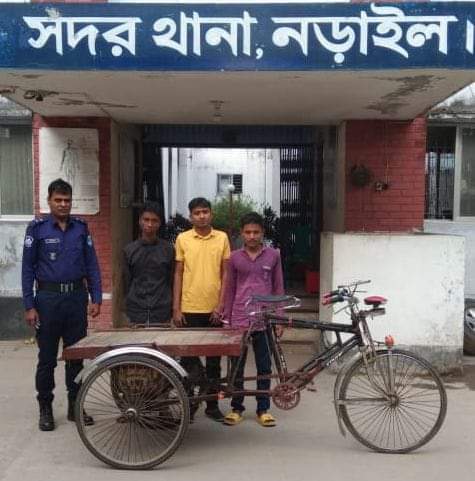 নড়াইলে চোরাই ভ্যানসহ তিন চোরকে গ্রেফতার করেছে সদর থানা পুলিশ। নড়াইল সদর থানার অফিসার ইনচার্জ মোঃ ওবাইদুর রহমান বলেন, ইজিভ্যান চোর চক্রের তিন সদস্য হলো মোঃ নুরুন্নবী শেখ(৩২), মোঃ হুসাইন মোল্লা(১৯) ও মোঃ আনোয়ার মোল্লার কাছ থেকে আটককৃতদের হেফাজত হতে চোরাই ইজি ভ্যানটি উদ্ধার করা হয়। গ্রেফতারকৃত মোঃ নূরনবী শেখ নড়াইল সদর থানাধীন কোমখালী পূর্বপাড়া গ্রামের মোঃ চাঁন মিয়ার ছেলে। মোঃ হোসেন মোল্লা একই গ্রামের মোঃ জিয়া মোল্লার ছেলে। মোঃ আনোয়ার মোল্লা কোমখালী চরপাড়া গ্রামের মোঃ আহাদ মোল্লার ছেলে।