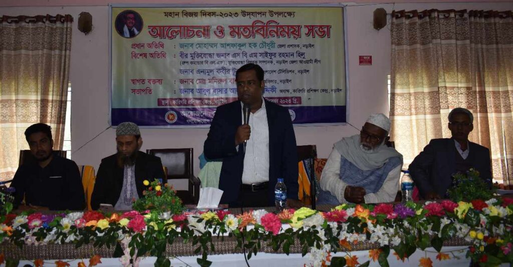 নড়াইল জেলা তথ্য অফিসের আয়োজনে বিজয় দিবসের আলোচনা ও মতবিনিময় সভা অনুষ্ঠিত হয়েছে ৷ মুক্তিযুদ্ধের চেতনায় বাংলাদেশ বিনির্মাণের লক্ষ্যে বর্তমান ও আগামী প্রজন্মকে নিয়ে জেলা তথ্য অফিস, নড়াইলের উদ্যোগে। উজ্জ্বল রায়, নড়াইল থেকে জানান, বৃহস্পতিবার (২১ ডিসেম্বর) সকাল ১১ টার সময় নড়াইল কারিগরি প্রশিক্ষণ কেদ্র মিলনায়তনে বিজয় দিবসের আলোচনা ও মতবিনিময় সভা অনুষ্ঠিত হয়েছে ৷ উক্ত অনুষ্ঠানে প্রধান অতিথি হিসেবে উপস্থিত ছিলেন জনাব এম এম আরাফাত হোসেন, অতিরিক্ত জেলা প্রশাসক (শিক্ষা ও আইসিটি), নড়াইল ৷ মূল আলোচনা উপস্থাপন করেন বীর মুক্তিযোদ্ধা এস বি এম সাইফুর রহমান হিলু, মুক্তিযোদ্ধা বিষয়ক সম্পাদক, নড়াইল জেলা আওয়ামীলীগ ৷ স্বাগত বক্তব্য রাখেন মো: মনিরুল বাশার, জেলা তথ্য অফিসার, নড়াইল। অনুষ্ঠানের সভাপতিত্ব করেন আবুল বাসার আল মামুন সিদ্দিকী, অধ্যক্ষ কারিগরি প্রশিক্ষণ কেন্দ্র, নড়াইল। মহান বিজয় দিবসের আলোচনা ও মতবিনিময় সভায় বক্তারা একাত্তরের মহান মুক্তিযুদ্ধে জাতির পিতা বঙ্গবন্ধু শেখ মুজিবুর রহমানের অবদানের কথা স্মরণ করে বলেন, বঙ্গবন্ধুর শক্ত হাত, মেধা, সাহস ও বলিষ্ঠ নেতৃত্বের মাধ্যমে দীর্ঘ ৯ মাস যুদ্ধ করার পর ১৯৭১ সালের আজকের এই মাসে বাঙালির সবচেয়ে শ্রেষ্ঠ অর্জন বিজয় অর্জিত হয়। আমাদের সবার উচিত দেশের ইতিহাস সঠিকভাবে জানা। বর্তমান তরুণ ও নতুন প্রজন্মের অনেকেই আমাদের গৌরবময় সোনালি ইতিহাস ভালো করে জানে না। ৷ সবারই উচিত মুক্তিযুদ্ধের চেতনায় উজ্জীবিত হয়ে দেশকে ভালোবাসা, দেশের জন্য কাজ করা। দীর্ঘ নয় মাসের রক্তক্ষয়ী যুদ্ধের ফসল এ স্বাধীন সার্বভৌম বাংলাদেশ। মুক্তিযুদ্ধের লক্ষ্য ও চেতনা বাস্তবায়নে নিজ নিজ অবস্থান থেকে আরো বেশি অবদান রেখে দেশ ও জাতিকে উন্নয়ন ও সমৃদ্ধির পথে এগিয়ে নিতে বক্তারা সকলের প্রতি আহ্বান জানান। অনুষ্ঠানে প্রায় দেড় শতাধিক বিভিন্ন পর্যায়ের পেশা-শ্রেণির জনগণ উপস্থিত ছিলেন ৷