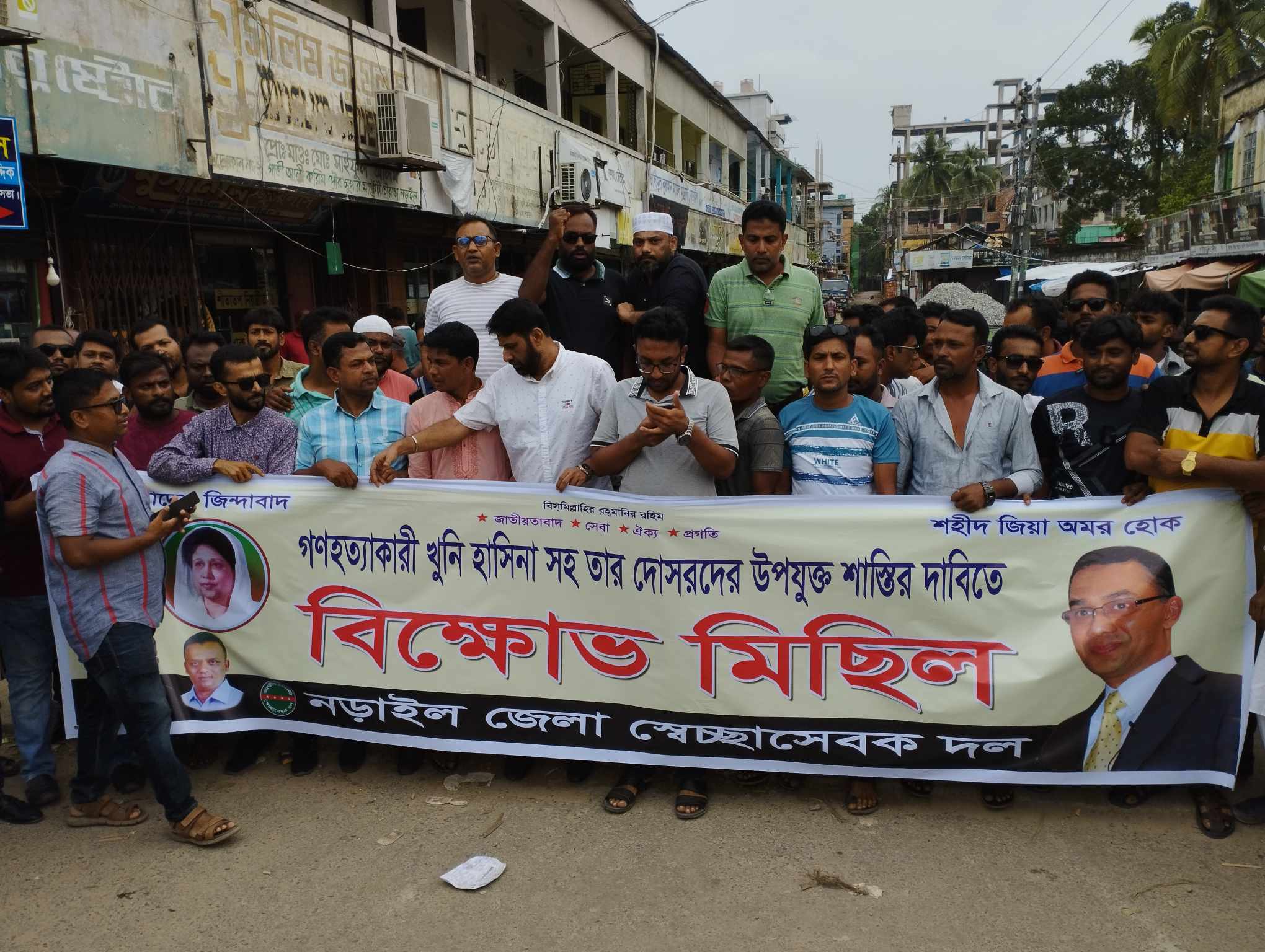 বৃহস্পতিবার (২২ আগস্ট) বিকালে নড়াইল জেলা স্বেচ্ছাসেবক দলের ব্যানারে বিএনপির কার্যালয় থেকে বিক্ষোভ মিছিল বের হয়ে শহরের প্রধান প্রধান সড়ক প্রদক্ষিণ শেষে একই স্থানে এসে শেষ হয়।