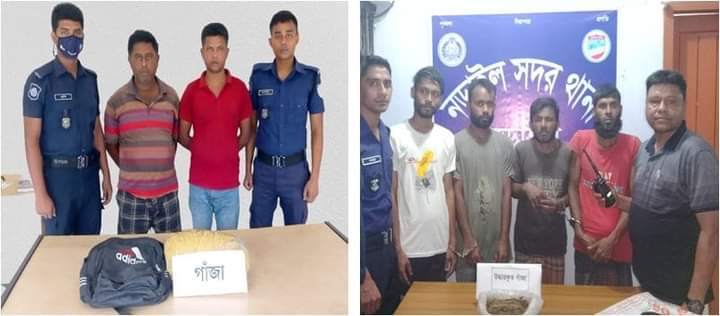 গোপন সংবাদের ভিত্তিতে ৯ মে (মঙ্গলবার) দিবাগত রাতে লোহাগড়া থানার অফিসার ইনচার্জ নাসির উদ্দিনের দিক-নির্দেশনায় এসআই (নিঃ) আশিকুজ্জামান সঙ্গীয় ফোর্সসহ স্কুলব্যাগে গাঁজা বহনের সময় লোহাগড়া বাজার থেকে আলামিন শেখকে ১ কেজি ৮০০ গ্রাম গাঁজাসহ তার সহযোগী বাসুদেবকে আটক করে। অন্যদিকে নড়াইল সদর থানার অফিসার ইনচার্জ জনাব ওবাইদুর রহমানের তত্ত্বাবধানে শেখহাটি পুলিশ ক্যাম্পের এসআই(নিঃ) টিপু সুলতান সঙ্গীয় ফোর্সসহ শেখহাটি মোজেরপাড়া এলাকায় অভিযান চালিয়ে গাঁজা ক্রয়-বিক্রয়ের সময় রবিউলের নিকট থেকে ২৫০ গ্রাম গাঁজাসহ তার ৩ (তিন) সহযোগীকে আটক করে। আসামিদের বিজ্ঞ আদালতে সোপর্দ করা হয়েছে। মাদকমুক্ত নড়াইল গড়ার লক্ষ্যে সুযোগ্য পুলিশ সুপার মহোদয়ের নির্দেশনায় জেলা পুলিশ বদ্ধপরিকর।