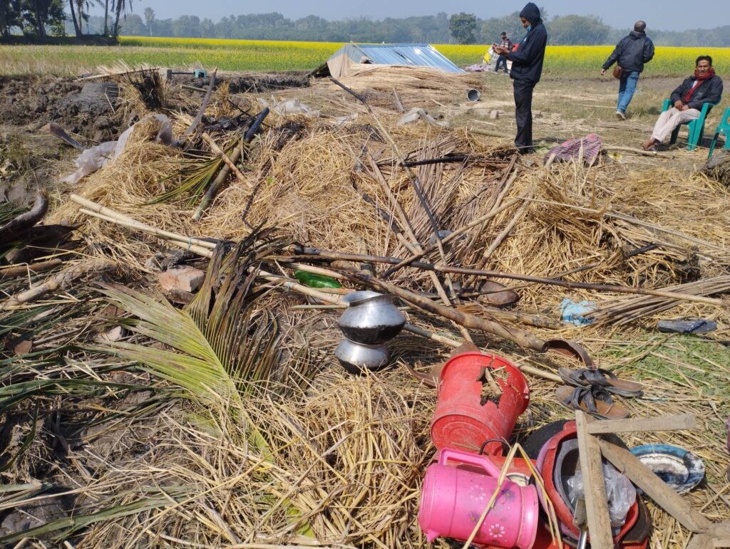 ক্ষতিগ্রস্থ জামাল শেখ ও সালাম শেখ জানান, প্রায় ৩বছর আগে দেবভোগ গ্রামের রাধাবল্লভ বিশ^াস সহজ তার তিন ভাইয়ের কাছ থেকে ১ একর ২৬শতক জমি কেনা হয়। ৮৭নং দেবভোগ মৌজার আর.এস খতিয়ান নং-১২৪৩, আরএস ২৮৭৪ ও ২৮৭৫ দাগের ৯৬ শতক জমি এবং আর.এস খতিয়ান ৮১১, দাগ নং-২৮৯০ এর ২৪ শতক এবং অন্য আরেকটি দাগে ৬ শতক জমি ক্রয় করেন। নিয়মানুযায়ী জমি রেজিষ্ট্রেশন ও নামপত্তন সম্পন্ন হয়। এরপর তিন মাস আগে ওই জমিতে বাড়িঘর নির্মাণ করে সালাম ও জামাল শেখ বসবাস করে আসছিলো। হঠাৎ করে রোববার রাতে রাধাবল্লভের ভাইপো সুফল বিশ^াসের নেতৃত্বে ১০/১৫জন তাদের বাড়িঘর ভাংচুর করে আগুন লাগিয়ে দেয়। এসময় একটি বসতঘর, একটি রান্না ঘর ও বাথরুম সহ বাড়ির জিনিসপত্র ভাংচুর ও পুড়িয়ে দেয়া হয়েছে। এ কারনে প্রচন্ড এই শীতে আমাদের ২ পরিবারের ১৫জন সদস্য খোলা আকাশের নিচে রয়েছি।