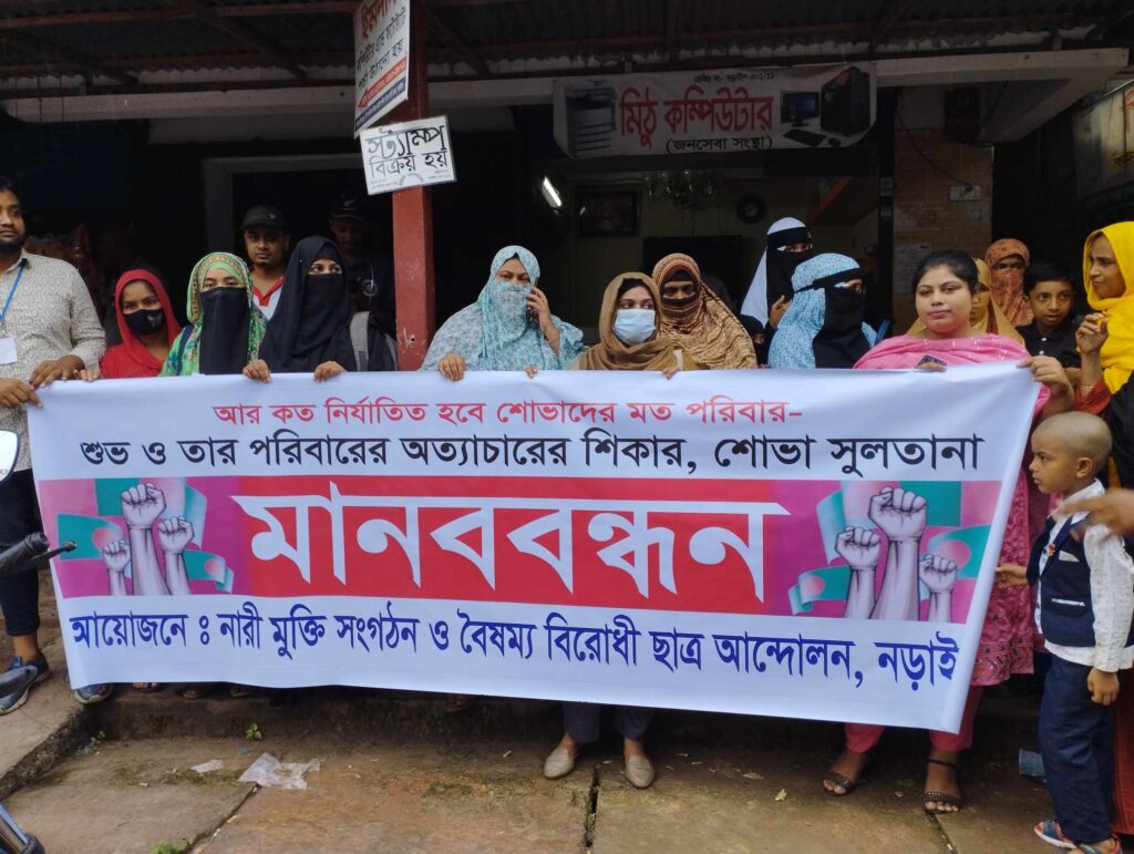 নড়াইল প্রতিনিধিঃ সরকার পরিবর্তনের পরপরই স্ত্রীর করা জালিয়াতি মামলা তুলে নেবার হুমকি দিচ্ছেন স্বামী মোজাহিদ ও তার পরিবারের লোকেরা,এই ভয়ে মানববন্ধন করেছে পরিবারের লোকেরা। বৈষম্যবিরোধী ছাত্র আন্দোলনের ব্যানারে রবিবার(১৮আগষ্ট) দুপরে নড়াইল ডিসি অফিস চত্ত¡রে মানব বন্ধনে অংশ নেয় স্থানীয় শিক্ষার্থী রা। মানবন্ধনে অংশ নেয় স্ত্রী শোভা সুলতানা, তার মা ও স্থানীয় ছাত্র-ছাত্রীরা। অভিযোগ,পরিবারের নানা জায়গা থেকে ধারদেনা করে স্বামীকে বিদেশে পাঠাতে স্বামী মোজাহিদ কে ১৫ লক্ষ টাকা প্রদান করে শোভা সুলতানার পরিবার।এরপর বিদেশে সে বিয়ে করে। চলতি বছরের ১১ জুন স্বামীর বিরুদ্ধে ১৫ লক্ষ টাকার জালিয়াতি মামলা করে স্ত্রী শোভা সুলতানা। স্বামীর নামে করা প্রতারনার ফেরত না পেয়ে নানা জায়গায় ধন্না দিচ্ছে সে। এই অবস্থায় গত ১৬ আগষ্ট নড়াইল চৌরাস্তায় শোভা সুলতানা কে মামলা তুলে নেবার হুমকী দিচ্ছে শ^শুর মহিদুল,শ^াশুড়ি সেফালী বেগম,ননদ তাসমিম ঐশি সহ কয়েকজন। স্বামী মোজাহিদুল ইসলাম শুভ লন্ডন থেকে হুমকী দিচ্ছে। শোভা সুলতানা বলেন,এই বিষয়ে ১৭ আগষ্ট সদর থানায় একটি অভিযোগ দায়ের করেছি,তারপরও আমি ও আমার পরিবার এখন হত্যার হুমকীর মধ্যে আছি।