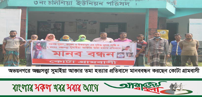 স্টাফ রিপোর্টার: যশোরের অভয়নগর উপজেলার সাত মাসের অন্তঃসত্ত্বা সুমাইয়া আক্তার তমা হত্যার বিচারের দাবিতে ফুঁসে উঠেছে এলাকাবাসী। সোমবার সকাল ১১টায় উপজেলার চলিশিয়া ইউনিয়ন পরিষদচত্ত্বরে এ দাবিতে মানববন্ধন অনুষ্ঠিত হয়। এ সময় তমাকে পরিকল্পিতভাবে হত্যার সাথে জড়িত উপজেলার কোটা গ্রামে সুজন, রুবেল ও ইকরামুলের দৃষ্টান্তমূলক শাস্তির দাবি করে বক্তব্য রাখেন তমার পিতা আব্দুল জলিল শেখ ও মাতা নাসিমা বেগম ।
