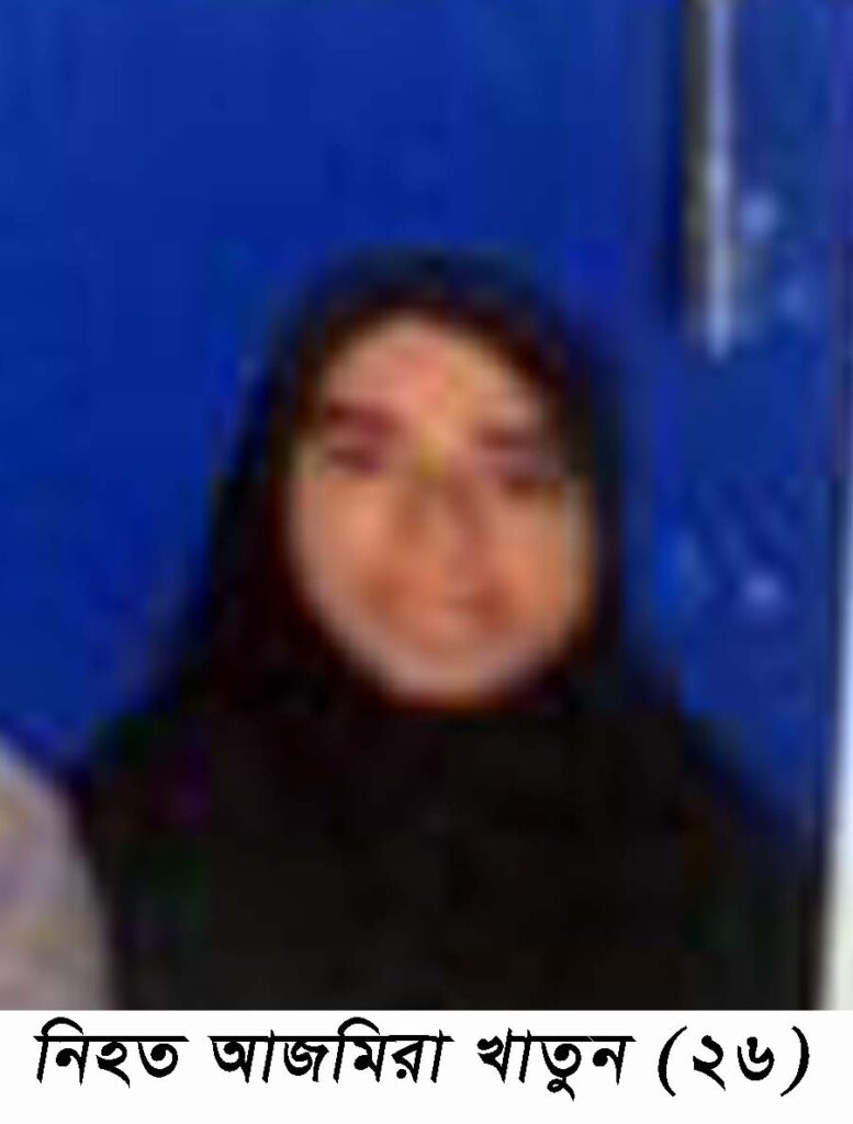 যৌতুকের টাকা না দেওয়ায় গৃহবধূ আজমিরা খাতুন(২৬)কে নির্যাতনের পর হত্যা করে লাশ ঝুঁলিয়ে রাখা হয়েছে বলে অভিযোগ উঠেছে। ঘটনার দুই সপ্তাহ পর নিহতের মাতা মেহেরুন্নেছা বাদি হয়ে নারী ও শিশু নির্যাতন ট্রাইবুনালে হত্যা মামলা দায়ের করেছেন। মামলা নং ১৫০/২৩ তারিখ ১৬/০৮/২৩।