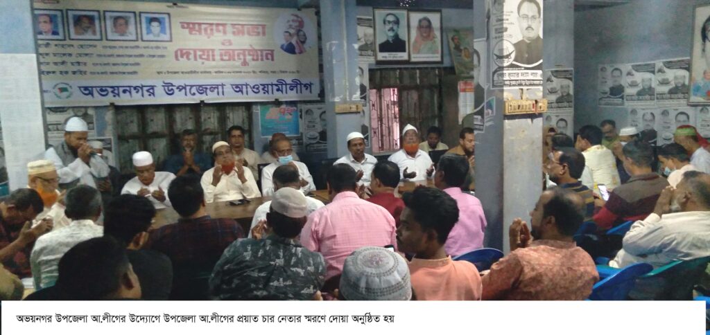 স্টাফ রিপোর্টার: অভয়নগর উপজেলা আ.লীগের প্রয়াত নেতা ফারাজী শাহদাত হোসেন, আব্দুল মালেক মোল্যা, হাসান আলী মাষ্টার ও জহিরুল হক জহিরের স্মরণে আলোচনা সভা ও দোয়া মাহফিল অনুষ্ঠিত হয়েছে। উপজেলা আ.লীগের উদ্যোগে শনিবার বিকালে উপজেলা দলীয় কার্যালয়ে অনুষ্ঠিত সভায় সভাপতিত্ব করেন উপজেলার আ.লীগের সভাপতি এনামুল হক বাবুল। সভায় বক্তব্য রাখেন উপজেলা আ.লীগের সাধারণ সম্পাদক সরদার ওলিয়ার রহমান, উপজেলা আ.লীগের সহসভাপিত সানা আব্দুল মান্নান, উপজেলা আ,লীগের সাবেক সাধারণ সম্পাদক গাজী নজরুল ইসলাম, আ.লীগ নেতা ইব্রহিম হোসেন বিশ^াস, সরদার রফিকুল ইসলাম, শ্রমিকলীগ নেতা নজরুল ইসলাম ফারাজী, উপজেলা আ.লীগ নেতা জাহাঙ্গীর আলম, ফারুক হোসেন, লায়লা খাতুন, উপজেলা যুবলীগের সাবেক সভপতি আব্দুর রউফ মোল্যা, উপজেলা যুবলীগের আহবায়ক কাউন্সিলর তালিম হোসেন প্রমুখ। সভায় উপস্থিত ছিলেন ইউনিয়ন ও পৌর সভার সকল ওয়ার্ডের নেতা কর্মীরা। আলোচনা শেষে দোয়া মাহফিল অনুষ্ঠিত হয়।