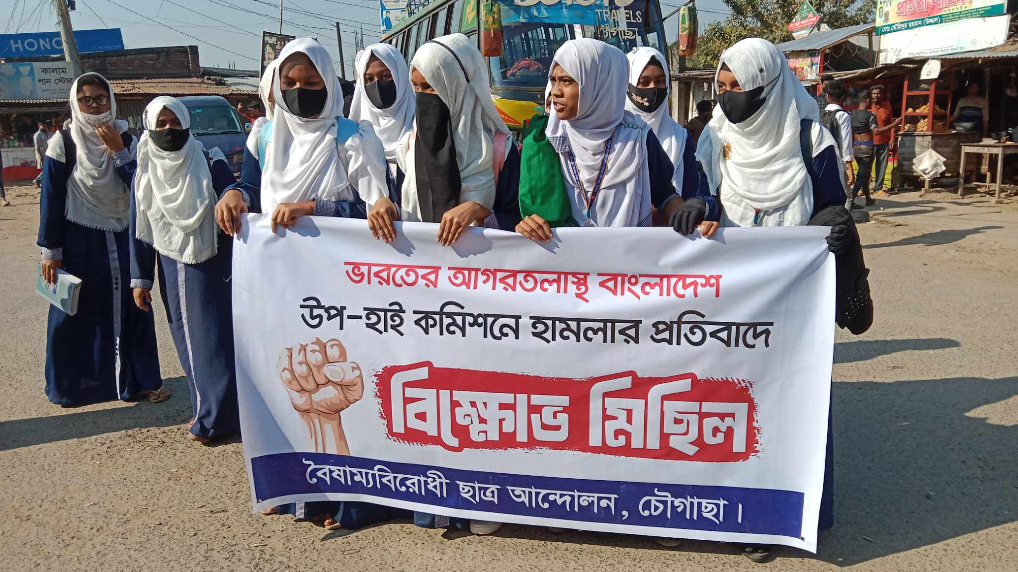 ভারতের আগরতলায় সহকারী হাইকমিশনে হিন্দুত্ববাদী সন্ত্রাসীদের হামলা ও ভাঙচুরের প্রতিবাদে যশোরের চৌগাছায় বিক্ষোভ মিছিল ও সমাবেশ করেছে বৈষম্যবিরোধী ছাত্র আন্দোলনের শিক্ষার্থীরা। মঙ্গলবার (০৩ ডিসেম্বর) দুপুর দেড়টায় শহরের সরকারি শাহাদাৎ পাইলট মডেল মাধ্যমিক বিদ্যালয় প্রাঙ্গন থেকে বিক্ষোভ মিছিল শুরু হয়। প্রায় অর্ধশতাধিক শিক্ষার্থীদের অংশগ্রহণে আয়োজিত মিছিলটি বাজারের বিভিন্ন গুরুত্বপূর্ণ সড়ক প্রদক্ষীন শেষ ভাস্কর্য মোড়নএসে এক সমাবেশে রুপ নেয়।