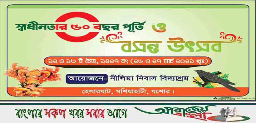 স্বাধীনতার ৫০ বছর পূতি ও বসন্ত উদযাপন কেন্দ্র করে আসছে আগামী ২৬ ও ২৭ মার্চ নীলিমা নিবাস বিদ্যাশ্রমে অনুষ্ঠিত হতে যাচ্ছে বসন্ত উৎসব। আয়োজনে থাকছেন নীলিমা নিবাস বৃদ্ধাশ্রম। হেলারঘাট মশিয়াহাটী মনিরামপুর যশোর।
