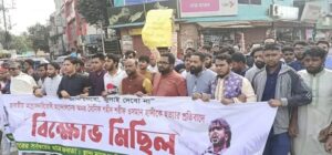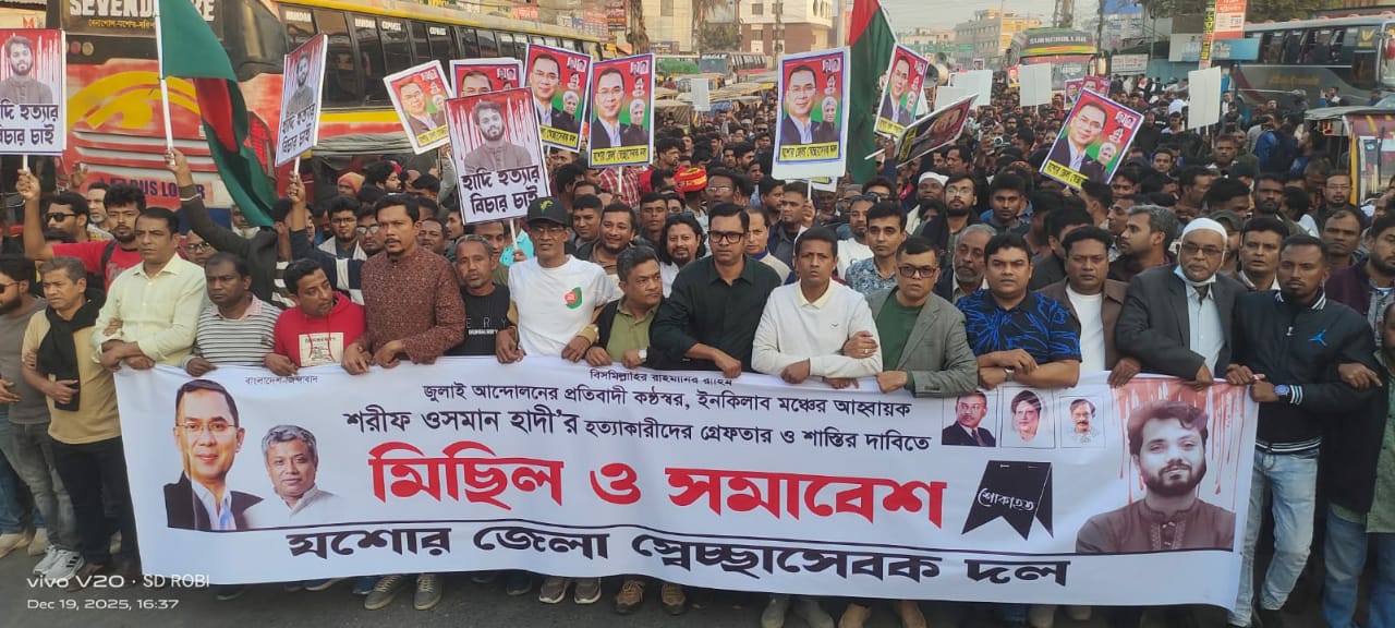 জুলাই গণঅভ্যুত্থানের ছাত্রজনতার ব্যানারে ইনকিলাব মঞ্চের মুখপাত্র শরীফ ওসমান হাদী হত্যার সুষ্ঠু বিচার এবং ভারতীয় আগ্রাসন দমনের দাবিতে যশোরে বিক্ষোভ মিছিল অনুষ্ঠিত হয়েছে।