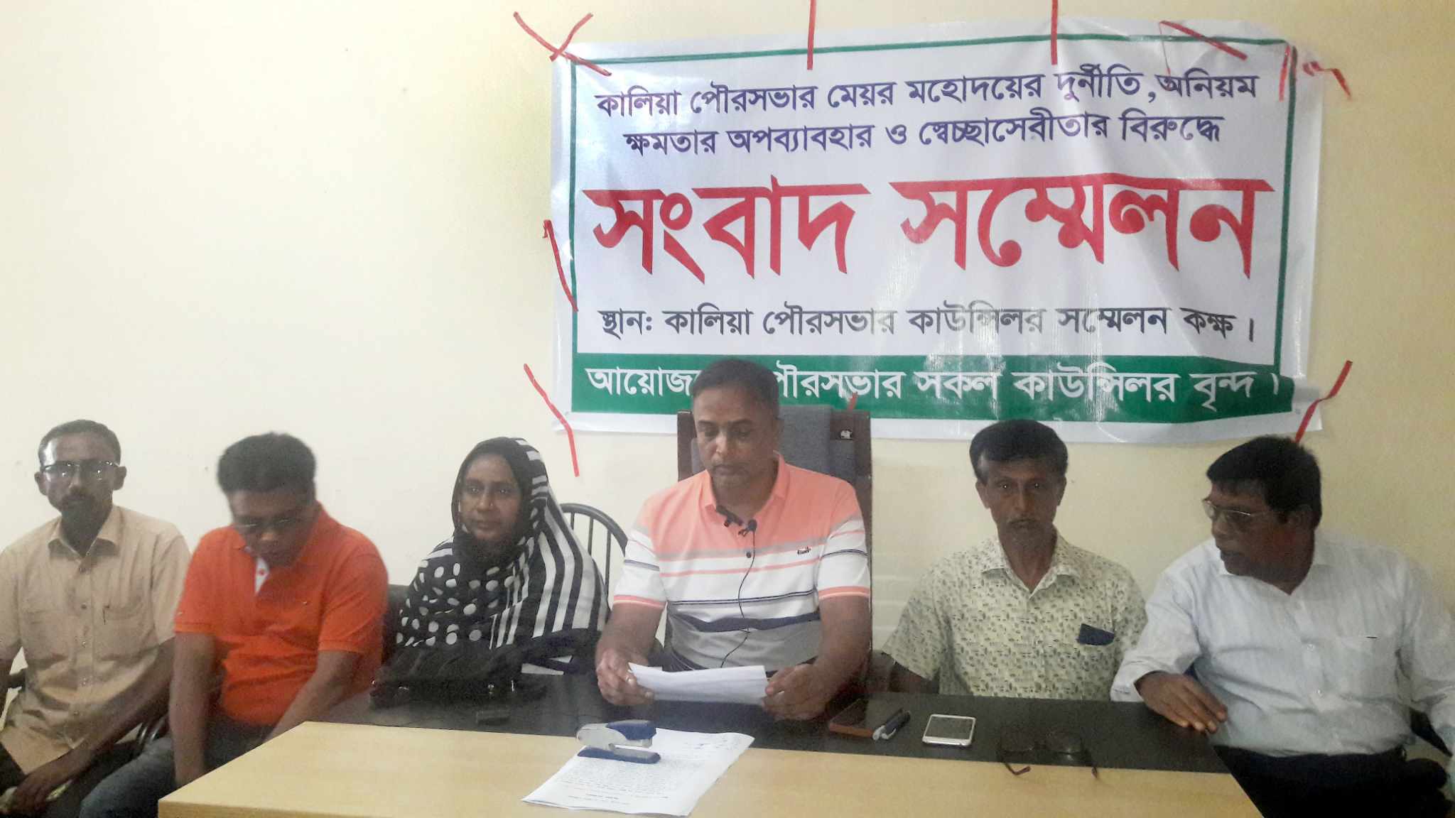 নড়াইলের কালিয়া পৌরসভার মেয়র ওয়াহিদুজ্জামান হীরার বিরুদ্ধে দুর্নীতি, অনিয়ম, সেচ্ছাচারিতার ও ক্ষমতার অপব্যবহারের অভিযোগ পাওয়া গেছে। এ ঘটনায় সোমবার (৩ জুন) সকাল সাড়ে ১০টার দিকে কাউন্সিলরদের সভাকক্ষে সংবাদ সম্মেলন অনুষ্ঠিত হয়। পৌরসভার ১০ জন কাউন্সিলর সংবাদ সম্মেলনে উপস্থিত ছিলেন। লিখিত অভিযোগে প্যানেল মেয়র আসলাম ভূঁইয়া বলেন, কালিয়া পৌরসভার মেয়র ওয়াহিদুজ্জামান হীরা হাট-বাজার ইজারা বন্দোবস্তের মাধ্যমে গত ১৪২৮ বঙ্গাব্দে ৬ লাখ ৫৭ হাজার ৫০০ টাকা, ১৪২৯ বঙ্গাব্দে ৪ লাখ ৪ হাজার ৫০১ টাকা, ১৪৩০ বঙ্গাব্দে ১৩ লাখ ৬৫ হাজার ৬০০ টাকা ইজারা গ্রহীতাদের কাছ থেকে ব্যক্তিগত ভাবে গ্রহণ করেছেন। টাকার মোট পরিমাণ ২০ লাখ ৬৭ হাজার ৬০১। এ টাকা তিনি পৌরসভায় জমা দেননি। এছাড়া ১৪৩১ বঙ্গাব্দে ৩ লাখ ১৬ হাজার ৯০০ টাকা অনাদায়ী রয়েছে। এদিকে, ভ্যানহাটের সর্বোচ্চ দরদাতাকে ইজারা না দিয়ে মেয়র ব্যক্তিগত ক্ষমতা প্রয়োগে দ্বিতীয় দরদাতাকে ইজারা দিয়েছেন। এছাড়া নিয়ম নীতির তোয়াক্কা না করে ব্যক্তিগত পছন্দের লোক দিয়ে সাতটি হাট-বাজার খাজনা আদায় করে সেই টাকা মেয়র নিজেই আত্মসাত করেছেন। পৌরসভার দু’টি করে রোলার এবং ট্রাক ব্যক্তিগত ভাবে ভাড়া দিয়ে সেই টাকাও আত্মসাত করার অভিযোগ রয়েছে মেয়রের বিরুদ্ধে। অপরদিকে, কাউন্সিলরদের না জানিয়ে বিভিন্ন জায়গা বন্দোবস্ত প্রদান করা এবং উন্নয়নমূলক কাজে কাউন্সিলরদের সম্পৃক্ত না করে মেয়রের ইচ্ছেমতো প্রকল্প বাস্তবায়ন করার অভিযোগ পাওয়া গেছে। এছাড়া পৌরসভার কমিউনিটি সেন্টারের সামনের জায়গা দখল করে ব্যক্তিগত মার্কেট নির্মাণ করছেন তিনি। মাস্টাররোলেও অপ্রয়োজনীয় কর্মচারীদের নিয়োগ করেছেন। সংবাদ সম্মেলনে উপস্থিত-প্যানেল মেয়র আসলাম ভূঁইয়াসহ ১ নম্বর ওয়ার্ডের কাউন্সিলর অশোক কুমার ঘোষ, ২ নম্বর ওয়ার্ডের তপন কুমার দত্ত, ৫ নম্বর ওয়ার্ডের সবুর শেখ, ৬ নম্বর ওয়ার্ডের প্রদীপ বর্মন, ৭ নম্বর ওয়ার্ডের মাহাবুব শেখ, ৮ নম্বর ওয়ার্ডের এহসানুল হক রানা, ৯ নম্বর ওয়ার্ডের সরদার মুজিবর রহমান এবং সংরক্ষিত মহিলা কাউন্সিলর শাহানাজ পারভীন রীতা ও নাসরীন বেগম বলেন, কালিয়া পৌরসভার মেয়র ওয়াহিদুজ্জামান হীরার দুর্নীতি, অনিয়ম, স্বেচ্ছাচারিতা এবং ক্ষমতার অপব্যবহারের কারণে পৌরসভার যে ক্ষতি হয়েছে; আমরা তা মেনে নেবো না। আত্মসাতকৃত টাকাও পৌরসভায় জমা দিতে হবে। আগামী ১০ কর্মদিবসের মধ্যে আমাদের দাবি পূরণ না হলে মাসিক সভা, বাজেট সভাসহ সব ধরণের কার্যক্রম আমরা বর্জন করব। এ ব্যাপারে কালিয়া পৌরসভার মেয়র ওয়াহিদুজ্জামান হীরা বলেন, আমার বিরুদ্ধে যেসব অভিযোগ করা হয়েছে; তা উদ্দেশ্যমূলক। কোনো ধরণের টাকা আত্মসাতের ঘটনা ঘটেনি। হাট-বা