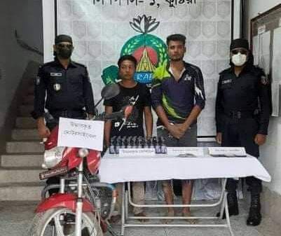 কুষ্টিয়া জেলা প্রতিনিধি, আবীর হাসান স্বাধীন :- কুষ্টিয়ায় র্যাবের বিশেষ অভিযানে ৮০ বোতল ফেন্সিডিল ও মোটরসাইকেল সহ ২ জন মাদক ব্যবসায়ী গ্রেফতার হয়েছে। র্যাব সুত্রে জানা যায়, কুষ্টিয়া র্যাব-১২, সিপিসি-১, ভারপ্রাপ্ত কোম্পানী কমান্ডার মোঃ মোস্তাফিজুর রহমানের নেতৃত্বে কুষ্টিয়া র্যাব ১২ ক্যাম্পের একটি চৌকষ আভিযানিক দল মাদক বিরোধী অভিযান পরিচালনা করে গোপন সংবাদের ভিত্তিতে ২৭ আগষ্ট ২০২০ ইং তারিখ দুপুর ১.৪৫ ঘটিকার সময়,‘‘কুষ্টিয়া জেলার দৌলতপুর থানাধীন তারাগুনিয়া বাজারস্থ জৈনক মোঃ হাবিবুর রহমান উজ্জল এর বসতবাড়ীর সামনে পঁাকা রাস্তার উপর একটি মাদক অভিযান পরিচালনা করে ৮০ বোতল ফেন্সিডিল, ০৪ টি মোবাইল ফোন, ০৫ টি সীম কার্ড,নগদ ৬৬০/- (ছয়শত ষাট) টাকা সহ ২ জন আসামী ১। মোঃ দীপু (২৪), পিতা-মৃত মোশারফ হোসেন, সাং-তারাগুনিয়া,২। মোঃ আরিফুল ইসলাম (৩০), পিতা-মোঃ-আশরাফুল ইসলাম, সাং-মাদাপুর,