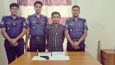 যশোর জেলাকে সন্ত্রাস, মাদক, চাঁদাবাজ, জঙ্গিবাদমুক্ত রাখার লক্ষ্যে জেলা পুলিশ সুপারের দিক নির্দেশনায় নিরলসভাবে কাজ করে যাচ্ছে জেলা পুলিশের কর্মকর্তারা। অতিরিক্ত পুলিশ সুপার, ‘ক’ সার্কেল বেলাল হোসাইন, পিপিএম এর সার্বিক তত্ত্বাবধানে এসআই সালাউদ্দিন খান, এসআই জয়ন্ত সরকার, এসআই আনসারুল হক, এসআই আলিমুজ্জামান গণের সমন্বয়ে গঠিত একটা চৌকস টিম কোতয়ালী মডেল থানা এলাকায় অভিযান পরিচালনা করে শনিবার সকালে কোতয়ালী মডেল থানাধীন টিবি ক্লিনিক এর পিছনে জনৈক প্রশান্ত এর পরিত্যক্ত জায়গার উত্তর পাশের সীমানার প্রাচীরের পাশ হতে টিবি ক্লিনিক মোড় এলাকার বাবুর ছেলে তালিকাভুক্ত সন্ত্রাসী সুমন ওরফে ট্যাটো সুমন ওরফে ইমন কে একটি ওয়ান শুটারগান ও এক রাউন্ড কার্তুজসহ গ্রেফতার করেন পুলিশ।