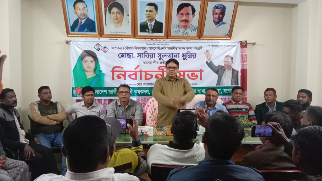 শ্যামল দত্ত চৌগাছা (যশোর) প্রতিনিধিঃ করব কাজ “গড়বো দেশ এই শ্লোগান সামনে রেখে চৌগাছায় কৃষক দলের উদ্যোগে ত্রয়োদশ জাতীয় সংসদ নির্বাচনে ধানের শীষ প্রতিকের বিজয় করার লক্ষ্যে নির্বাচনী সভায় অনুষ্ঠিত হয়েছে। রবিবার (২ ফেব্রুয়ারি) বিকাল ৪ নিএনপির অস্থায়ী অফিস কার্যালয় যশোর -২ (চৌগাছা -ঝিকরগাছা)আসনের ধানের শীষ নির্বাচনী সভায় উপজেলা কৃষক দলের সভাপতি আজগার আলীর সভাপতিত্বে প্রধান অতিথি হিসেবে উপস্থিত ছিলেন কেন্দ্র কৃষক দলের দপ্তর সম্পাদক শফিকুল ইসলাম শফিক, উপজেলা কৃষকদের সাধারণ সম্পাদক শাহানুর রহমান শাহিনের সঞ্চালনায় বিশেষ অতিথি হিসেবে উপস্থিত ছিলেন যশোর জেলা কৃষক দলের আহবায়ক হাবিবুল ইসলাম কচি, যশোর জেলা কৃষক দলের সদস্য সচিব শিকদার সালাউদ্দিন , যশোর জেলা কৃলদষক দলের যুগ্ন আহবায়ক ফুলমিয়া এছাড়া উপস্থিত ছিলেন সিনিয়ার সহ সভাপতি বিল্লাল হোসেন মানিক, সহ সভাপতি হারুনা রশিদ রিপন ও বকুল হোসেন ইখলাছ,উপজেলা কৃষক দলের যুগ্ন সাধারণ সম্পাদক আব্দুস সাত্তার ও আবুল হোসেন,মোঃ স্বাধীন, পৌর কৃষক দলের সভাপতি মিউপজেকা কৃষক দলের সাংগঠনিক সম্পাদক মনিরুল ইসলাম, জগদীশপুর ইউনিয়ন কৃষক দলের সভাপতি আব্দুল আহাদ, সিংহঝুলী ইউনিয়ন কৃষক দলের সভাপতি ওমর ফারুক সহ পৌর ও ইউনিয়ন সভাপতি /সম্পাদক, ওয়ার্ড পর্যায়ে সভাপতি ও সম্পাদক উপস্থিত ছিলেন।