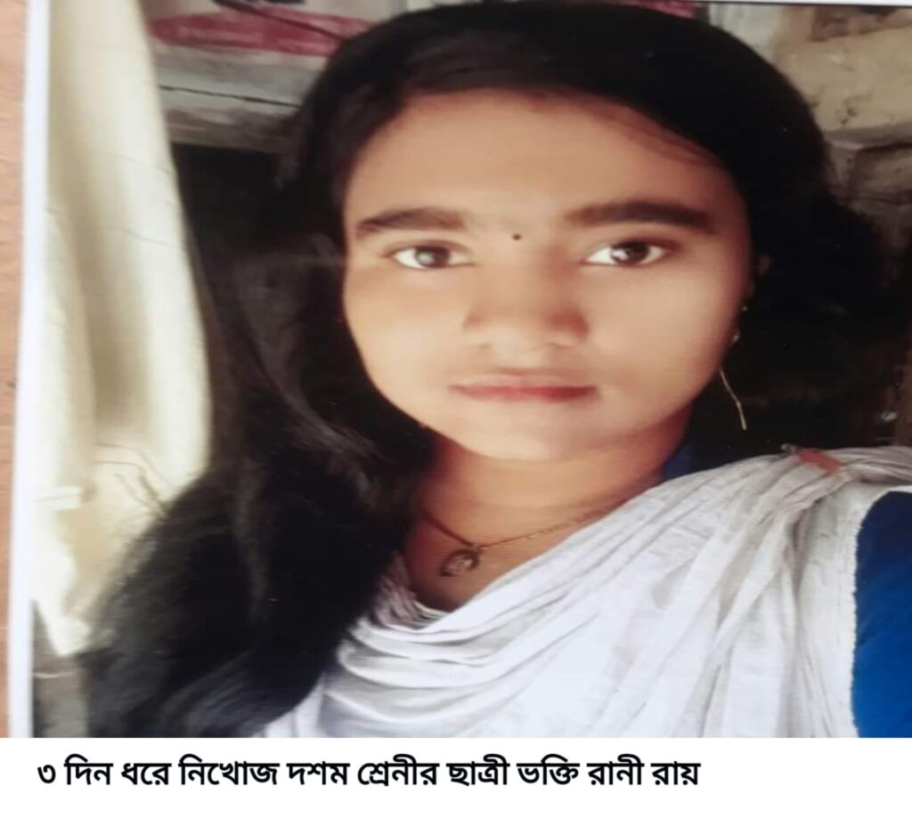 যশোরের চৌগাছায় ভক্তি রানী রায় নামে দশম শ্রেণীর এক স্কুল ছাত্রী তিন দিন ধরে নিখোঁজ রয়েছেন। এ ঘটনায় বৃহস্পতিবার (২৫ আগস্ট) স্কুল ছাত্রীর বাবা মেয়ের সন্ধান পেতে চৌগাছা থানায় একটি লিখিত অভিযোগ দায়ের করেছেন।