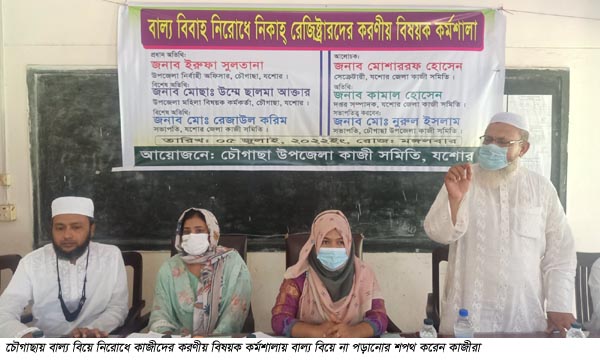 মঙ্গলবার (৫জুলাই) দুপুরে উপজেলা কাজী সমিতি’র আয়োজনে চৌগাছা সরকারি শাহাদৎ পাইলট মাধ্যমিক বিদ্যালয়ে ‘বাল্য বিবাহ নিরোধে নিকাহ্ রেজিষ্টারদের করণীয় বিষয়ক কর্মশালা’য় উপজেলার নিকাহ্ রেজিষ্টার (কাজী) এই শপথ করেন।