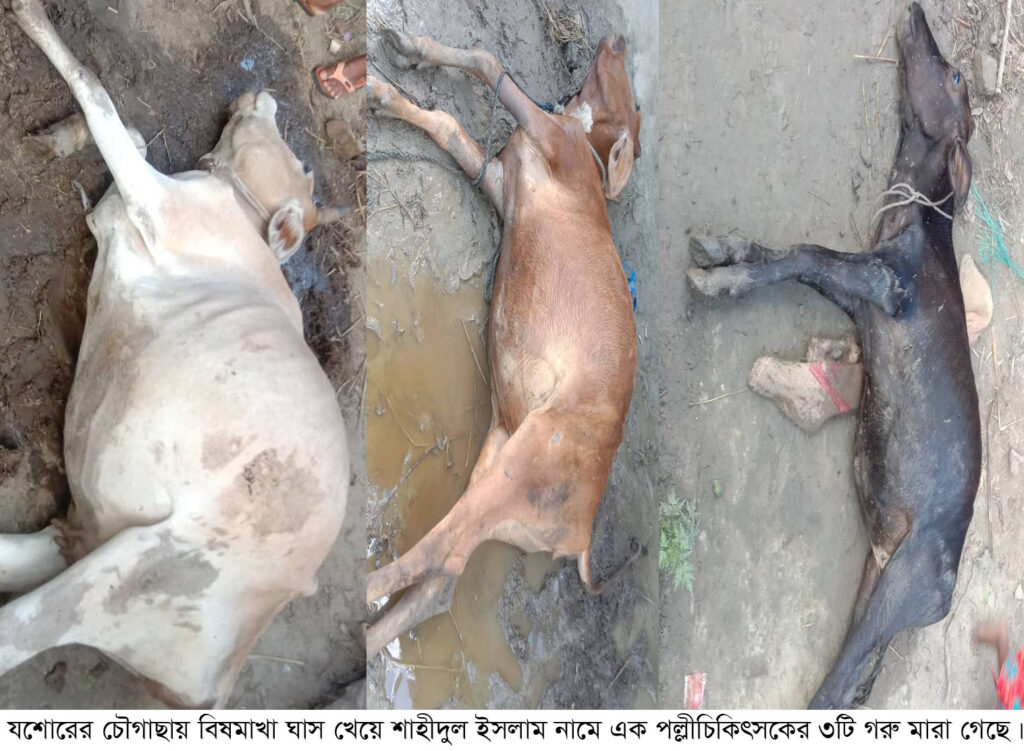 ক্ষতিগ্রস্থ পল্লীচিকিৎসক শাহীদুল ইসলাম জানান, প্রতিদিনের ন্যায় মঙ্গলবার দুপুরে মাঠ থেকে ঘাস কেটে এনে গরুর খেতে দিই। গরুর (নানদায়/ ডাবায়) ঘাস দিয়ে আমি বাজারে যায়। এক ঘন্টা পরে মোবাইলে খবর পাই আমার একটি গাভী গরু মাটিতে পড়ে পা দাপাদাপি করছে। আমি বাড়ীতে গিয়ে দেখি সেটি মারা গেছে। আমার চোখের সামনে বাকী দুটি গরু মাটিতে পড়ে মারা যায়। গরু তিনটির বর্তমান বাজার মুল্য প্রায় একলাখ পঞ্চাশ হাজার টাকা।