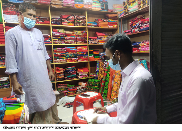 বৃহস্পতবিার বলো ১১ টা থকেে বলো সাড়ে ১২ টার মধ্যে উপজলো নর্বিাহী র্কমর্কতা প্রকৌশলী এনামুল হকরে নতেৃত্বে ভ্রাম্যমান আদালত পরচিালনা করে শহররে কাপুড়য়িাপট্টরি সবুজ ক্লথ স্টোররে মালকি নাসরি উদ্দনি ও তশিা বোরকা হাউজ জয়নুর রহমানকে ৫ হাজার করে ১০ হাজার টাকা জরমিানা করনে আদালত। এসময় দোকান খোলা রখেে পালয়িে যান সাগরকিা বস্ত্র বতিানরে মালকি মুন্না। আদালত দোকানে ফলেে রখেে যাওয়া তার একটি মুঠোফোন সটে জব্দ করে পুলশিরে জম্মিায় রাখনে। এছাড়া অভযিান ফাতমো র্গামন্টেস নামে অন্য এক দোকানওি দোকান খোলা রখেে পালয়িে যায়। এসময় সনো, বজিবিি ও পুলশি সদস্যরা তার সাথে ছলিনে।