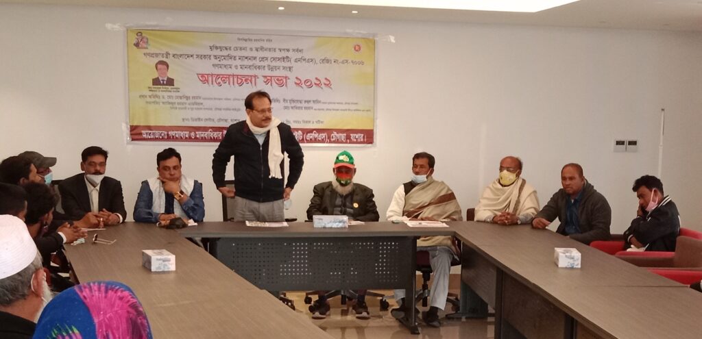 গণমাধ্যম ও মানবাধিকার উন্নয়ন সংস্থা ন্যাশনাল প্রেস সোসাইটি(এনপিএস) এর আলোচনা সভা অনুষ্ঠিত হয। গতকাল শুক্রবার বিকাল ৪ টায় ডিভাইন সেন্টারে গণমাধ্যম ও মানবাধিকার উন্নয়ন সংস্থা,ন্যাশনাল প্রেস সোসাইটি (এনপিএস) চৌগাছার আয়োজনে বাজার ব্যবসায়ী সমিতির ও চৌগাছা পাবলিক লাইব্রেরি যুগ্ন সাধারণ সম্পাদক এ্যাডমিরাল আজিজুর রহমানের সভাপতিত্বে প্রধান অতিথি হিসাবে বক্তব্য দেন উপজেলা চেয়ারম্যান ড.মোস্তানিছুর রহমান,বিশেষ অতিথি হিসাবে উপস্থিত ছিলেন সাবেক মুক্তিযোদ্ধা কমান্ডার বীর মুক্তিযোদ্ধা রুহুল আমিন,উপজেলা আওয়ামী লীগের সহ-সভাপতি ও পৌর কাউন্সিলার আতিয়ার রহমান,উপজেলা মহিলা আওয়ামী লীগের সহ-সভাপতি ও মহিলা প্যানেল মেয়র জোসনা খাতুন,মানবাধিকার উন্নয়ন সংস্থা ,ন্যাশনাল প্রেস সোসইটির সাবেক সহ-সভাপতি নাজিম উদ্দিন,উপদেষ্ট্য ইদ্দিস আলী,উপস্থিত ছিলেন সাংবাদিক শ্যামল দত্ত, পৌর স্বেচছাসেবক লীগের সভাপতি বকুল হোসেন,যুগ্ন সাধারণ সম্পাদক আসিফ আহমেদ,চৌগাছা ইউনিয়ন স্বেচছাসেবক লীগের যুগ্নআহবাক আবু তাহের ,চৌগাছা হাজী সরদার মর্ত্তজ আলী মাধ্যমিক বিদ্যালয়ের পি টি আই কমিটির সভাপতি মনিরুজ্জামান উজ্জল,শ্যামল বিশ্বাস,প্রশান্ত রায়,আল শিহাব রাজন প্রমুখ,