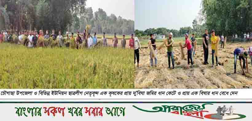 উপজলা ছাত্রলীগ নেতারা জানান, কেন্দ্রীয় ছাত্রলীগ ও যশোর জেলা ছাত্রলীগের নির্দেশনায় উপজেলার হাকিমপুর ইউনিয়নের চাকলা গ্রামের করিম মন্ডলের ছেলে মহিদুল ইসলামের প্রায় দুই বিঘা জমির ধান কেটে এবং প্রায় এক বিঘা জমির ধান বেধে দিয়েছে চৌগাছা উপজেলা ছাত্রলীগ। উপজেলা ছাত্রলীগের সভাপতি ইব্রাহিম হোসাইনের নেতৃত্বে চৌগাছা সদর ইউনিয়ন ছাত্রলীগের আহবায়ক আকরামুল ইসলাম, যুগ্ম আহবায়ক জিহাদ হোসেন, উপজেলা ছাত্রলীগ নেতা হাসান রেজা, পৌর ছাত্রলীগ নেতা সৌরভ রহমান বিপুল, পাশাপোল ইউনিয়ন ছাত্রলীগের সাধারণ সম্পাদক সবুজ হোসেন, হাকিমপুর ইউনিয়ন ছাত্রলীগের আহবায়ক ইয়াসিন আরাফাত, যুগ্ম আহবায়ক আবির মাহমুদ পলক, রাজন আহমেদ, সাইফুল ইসলাম, ছাত্রলীগ নেতা মিনহাজুর রহমান জিসাদ, পাভেল হোসেন, আক্তারুল ইসলাম, মিরাজ, নারায়নপুর ইউনিয়ন ছাত্রলীগ নেতা জাহিদ হোসেন, অন্তু, ফুলসারা ইউনিয়ন ছাত্রলীগ নেতা মাসুম হোসেন, হাফিজুর রহমান, মিসান আহমেদ, উপজেলা ছাত্রলীগ নেতা হাসিবুল হাসান শান্ত, রাসেদ হোসেনসহ উপজেলা ও বিভিন্ন ইউনিয়ন ছাত্রলীগের ৩০/৩৫জন নেতাকর্মী এই ধান কাটা ও বাধা কাজে অংশ নেন। ছাত্রলীগ নেতারা জানান ‘তাদের মধ্যে অনেকেই রোজা রেখেছিলেন। ধান কাটা ও বেঁধে দেয়া কাজে কৃষক মহিদুল খুবই খুশি হয়ে ছাত্রলীগ নেতাদের তার বাড়িতে নিয়ে যান। এবং যারা রোজা ছিলেন না তাদের জোর করে নাস্তাও করান।’