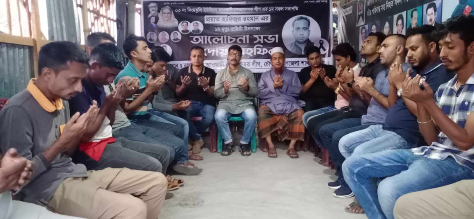 যশোরের চৌগাছার সিংহঝুলী ইউনিয়ন স্বেচ্ছাসেবক লীগের সভাপতি প্রয়াত হাফিজুর রহমানের ১ম মৃত্যুবার্ষিকী পালন করা হয়েছে। রবিবার (২২ অক্টোবর) বিকালে এ উপলক্ষে উপজেলা স্বেচ্ছাসেবক লীগ এক আলোচনা সভা ও দোয়া মাহফিলের আয়োজন করেন। অনুষ্ঠানে দোয়া পরিচালনা করেন মুক্তিযুদ্ধ ভাস্কর্য মোড় সংলগ্ন জামে মসজিদের পেশ ইমাম মাওলানা আব্দুর রাজ্জাক।
