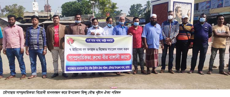 ‘সাম্প্রদায়িকতা রুখো, বীর বাঙ্গালী জাগো’ শ্লোগানে যশোরের চৌগাছায় মানববন্ধন করেছে হিন্দু বৌদ্ধ খৃষ্টান ঐক্য পরিষদ। শনিবার বেলা ১০ টা ১৫ মিনিটে শহরের মুক্তিযুদ্ধ ভাস্কর্য মোড়ে এই মানববন্ধন অনুষ্ঠিত হয়।