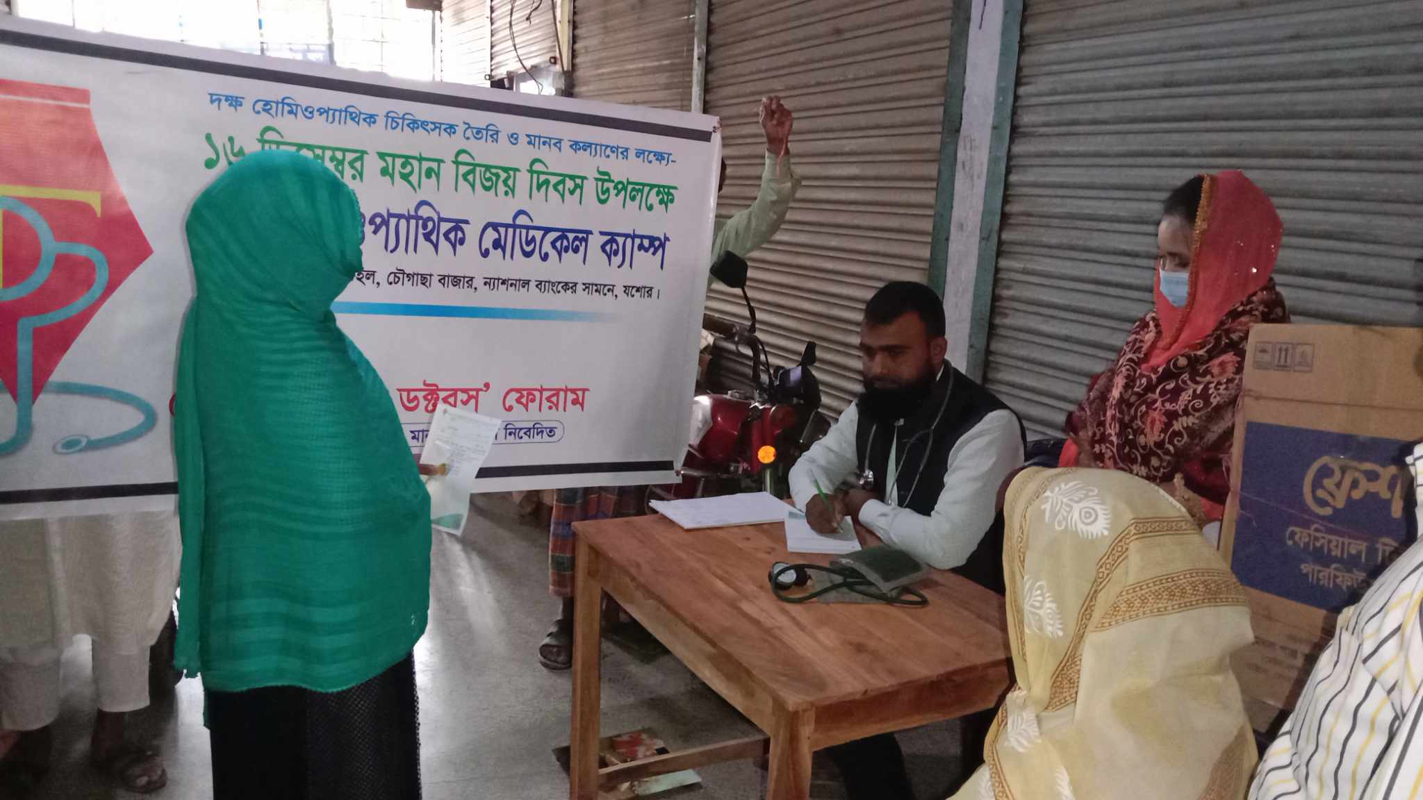 শ্যামল দত্ত চৌগাছা (যশোর) প্রতিনিধি ঃ যশোরের চৌগাছায় মহান বিজয় দিবস উপলক্ষে হোমিও প্যাথিক ফ্রি মেডিকেল ক্যাম্পে ঔষাধ ও চিকিৎসা সেবা পেল ৩০০ জন সাধারণ মানুষ । শনিবার (১৬ ডিসেম্বর) এফ এ হোমিও হল চত্বরে হোমিওপ্যাথিক ডক্টরস ফোরাম যশোরের আয়োজনে সকাল ৯টা থেকে দুপুর ২ টা পর্যন্ত চিকিৎসা প্রদান করা হয় ।