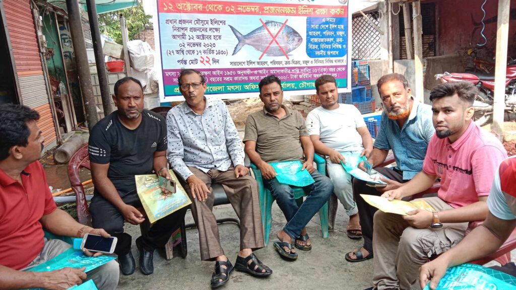 শ্যামল দত্ত চৌগাছা( যশোর) প্রতিনিধি ঃ যশোরের চৌগাছায় মা ইলিশ সংরক্ষণ অভিযান উপলক্ষে বাজার মাছ ব্যাবসয়ীর সাথে মতবিনিময় সভা অনুষ্ঠিত হয়েছে। বুধবার (১১ অক্টোবর) দুপুর ২টার সময় মাছ বাজার ব্যাবসয়ী সমবায় সমিতির চত্বর মা ইলিশ সংরক্ষণ -১২ অক্টোবর থেকে ২ নভেম্বর পর্যন্ত প্রজননক্ষম ইলিশ রক্ষা কার্যক্রম ও সারাদেশে ইলিশ আহারণ, পরিবহন, ক্রয়-বিক্রয় , মজুদ, বিনিময় নিষিদ্ধ থাকবে।মাছ ব্যবসায়ী কোন প্রকার অসৎ অবলম্বন করলে দন্ডনীয় অপরাধ শাস্তিও জরিমানা থাকতে। এক আলোচনা সভায় উপস্থিত ছিলেন উপজেলা মৎস্য অফিসার হরিদাস কুমার দেবনাথ, বাজার মৎস ব্যবসায়ী সমবায় সমিতির সভাপতি ইরামুল অর রশিদ টিটো,উপজেলা মৎস্য অফিসের ক্ষেত্র সহকারী মিজানুর রহমসন, আল্লাহর দান ফিস সাপ্লাইয়ার্স পক্ষে শহিদুল ইসলাম, ইল্লাল্লহ মৎস্য ভান্ডার পক্ষে রোকনুজ্জামান সুমন, কপোতাক্ষী ফিস সাপ্লাইশার্স পক্ষে মাসুদ রানা,