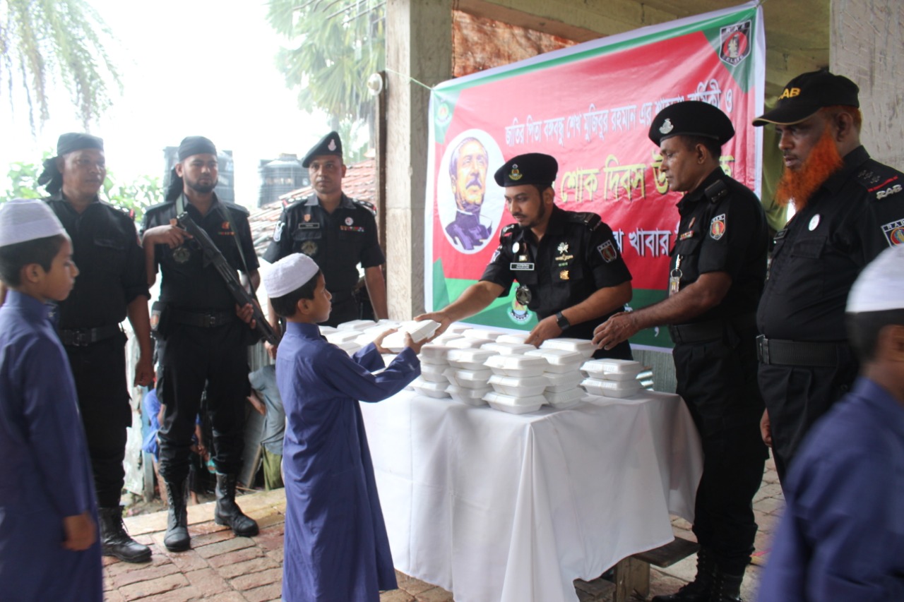 এরই ধারাবাহিকতায় জাতির পিতা বঙ্গবন্ধু শেখ মুজিবুর রহমান এর ৪৭তম শাহাদাৎ বার্ষিকী এবং জাতীয় শোক দিবস উপলক্ষে র্যাব-৬, সিপিসি-৩, যশোর ক্যাম্পের কোম্পানী কমান্ডার এম নাজিউর রহমান অদ্য ইং ১২ আগস্ট ২০২২ তারিখে যশোর কোতয়ালী মডেল থানাধীন হুসতলা মাঠপাড়া সংলগ্ন ফজলুল উলুম বাগে জান্নাত মাদ্রাসা ও এতিমখানার শিশুদের মাঝে খাবার বিতরণ করে।