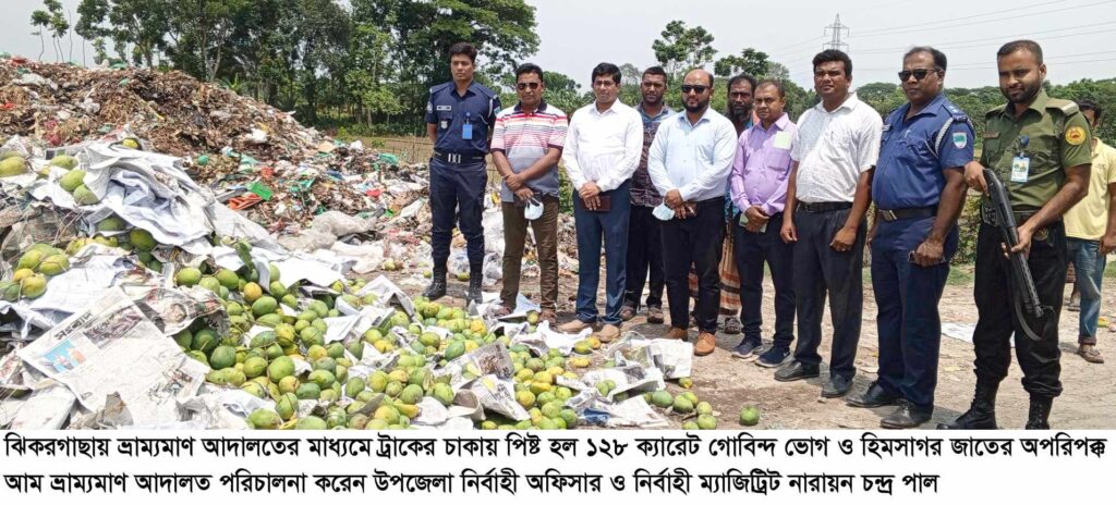 যশোরের ঝিকরগাছায় ভ্রাম্যমাণ আদালতের রায়ে ট্রাকের চাকায় পিষ্ট হল অপরিপক্ক ১২৮ ক্যারেট গোবিন্দ ভোগ ও হিমসাগর জাতের অপরিপক্ক আম ব্যবসায়ীরা অধিক মুনাফা অর্জনের লক্ষ্যে নির্ধারিত সময়ের পূর্বে বিষাক্ত কেমিক্যাল ব্যবহার করে বাজারজাতকরণের জন্য থানা পুলিশ আটক করেছে। থানা পুলিশ সূত্রে জানা যায়, বুধবার রাত সাড়ে ১২টার সময় গোপন সংবাদের উপর ভিত্তি করে যশোর—বেনাপোল মহাসড়কের ঝিকরগাছা ব্রীজের নিকটে শার্শা উপজেলার বেলতলা থেকে রাজধানী (ঢাকা)গামী ঢাকা মেট্রো ১১—৮৪৮৬নং এর একটি মিনি ট্রাকে ১২৮ ক্যারেট বিষাক্ত কেমিক্যাল ব্যবহার করা আম আটক করেন। প্রতিটি ক্যারেটে ২০ কেজি করে সর্বমোট ২হাজার ৫শত ৬ কেজি অপরিপক্ক আম পাওয়া যায়। পরবর্তীতে উপজেলা নির্বাহী অফিসার ও নির্বাহী ম্যাজিট্রিটকে অবগত করা হলে নির্ধারিত সময়ের পূর্বে বিষাক্ত কেমিক্যাল ব্যবহার করা আম দুপুর ১টার সময় কৃর্তিপুর সংলগ্ন পৌরসভার ময়লা ফেলার স্থানে নিয়ে ভ্রাম্যমান আদালতের মাধ্যমে ট্রাকের চাকায় পিষ্ট করে অপরিপক্ক আম গুলো বিনষ্ট করা হয়। এঘটানার পরে আমের সাথে আটক মিনি ট্রাকের ড্রাইভার ও হেলপারের নিকট হতে মুচলেকা নিয়ে ছেড়ে দেওয়া হয়েছে। এসময় উপস্থিত ছিলেন, উপজেলা নির্বাহী অফিসার ও নির্বাহী ম্যাজিট্রিট নারায়ন চন্দ্র পাল, থানার অফিসার ইনচার্জ কামাল হোসেন ভূঁইয়া, উপজেলা কৃষি অফিসার কৃষিবিদ মাসুদ হোসেন পলাশ, থানার সেকেন্ড অফিসার এসআই মোকলেছুজ্জামান, ঝিকরগাছা রিপোর্টার্স ক্লাবের সাধারণ সম্পাদক আফজাল হোসেন চাঁদ, সিনিয়র সহ সভাপতি মহাসিন আলাম, সহ প্রচার সম্পাদক মিঠুন সরকার, সদস্য বিশ্বজিৎ, উপ সহকারী কৃষি অফিসার নয়নানন্দন পাল নয়ন সহ আরো অনেকে।