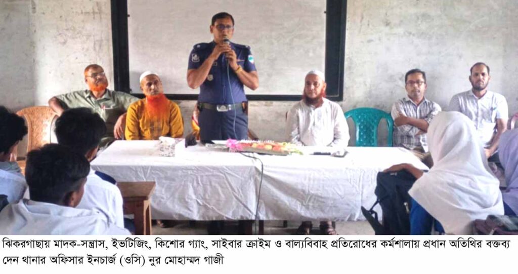 আফজাল হোসেন চাঁদ, ঝিকরগাছা : যশোরের ঝিকরগাছা উপজেলার ৪নং গদখালী ইউনিয়নের টাওরা আজিজুর রহমান মাধ্যমিক বিদ্যালয়ে শিক্ষার্থীদের মাঝে সচেতনতা সৃষ্টির লক্ষ্যে বাল্যবিবাহ, ইভটিজিং, মাদক, কিশোর গ্যাং এর বিরুদ্ধে প্রতিরোধমূলক বিষয়ের উপর কর্মশালার অনুষ্ঠিত হয়েছে। উক্ত কর্মশালায় প্রধান অতিথির বক্তব্য রাখেন থানা প্রশাসনের অফিসার ইনচার্জ (ওসি) নুর মোহাম্মদ গাজী। এসময় তিনি তার বক্তব্যে বলেন, মাদক, সন্ত্রাস ও ইভটিজিং নির্মূলে প্রশাসন জিরো টলারেন্স নীতি গ্রহণ করেছে। তোমরা মনোযোগ দিয়ে পড়াশোনা করে মা-বাবার মুখ উজ্জ্বল করো ও জাতির কল্যাণে ভূমিকা পালন করে এলাকার শ্রেষ্ঠ সন্তানের কাতারে তোমাদের নাম লিপিবদ্ধ করবে।