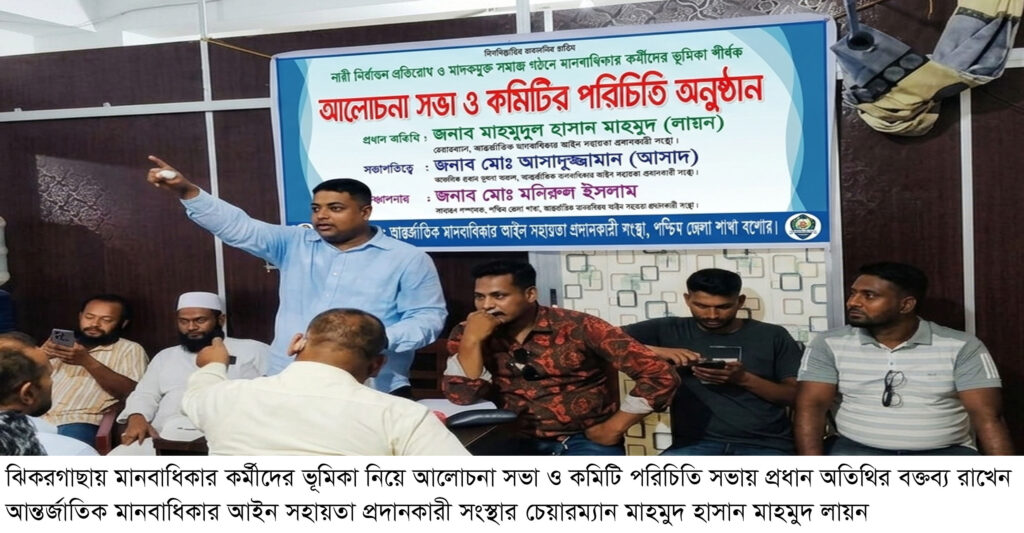 আফজাল হোসেন চাঁদ, ঝিকরগাছা : যশোরের ঝিকরগাছায় আন্তর্জাতিক মানবাধিকার আইন সহায়তা প্রদানকারী সংস্থার উদ্যোগে নারী নির্যাতন ও মাদকদ্রব্য নিয়ন্ত্রণে মানবাধিকার কর্মীদের ভূমিকা শীর্ষক এক আলোচনা সভা ও কমিটির পরিচিতি অনুষ্ঠান অনুষ্ঠিত হয়েছে। গতকাল বিকাল ৫টায় ঝিকরগাছার হল রোড সংলগ্ন আকবর সাহেবের বিল্ডিংয়ের দ্বিতীয় তলায় এ আয়োজন করা হয়। অনুষ্ঠানে সংস্থার আঞ্চলিক প্রধান (খুলনা অঞ্চল) ও পশ্চিম জেলা শাখা যশোরের সভাপতি আসাদুজ্জামান আসাদের সভাপতিত্ব ও পশ্চিম জেলা শাখার সাধারণ সম্পাদক মনিরুল ইসলাম মনিরের সঞ্চালনায় অনুষ্ঠানে প্রধান অতিথি ছিলেন সংস্থার চেয়ারম্যান মাহমুদ হাসান মাহমুদ লায়ন। তিনি তার বক্তব্যে সমাজে মানবাধিকার প্রতিষ্ঠা, নারী নির্যাতন প্রতিরোধ এবং মাদকদ্রব্য নিয়ন্ত্রণে মানবাধিকার কর্মীদের সক্রিয় ভূমিকার ওপর গুরুত্বারোপ করেন। বক্তব্য শেষে তিনি গত ২৫ অক্টোবর ও ১০ জানুয়ারি অনুমোদিত পশ্চিম জেলা শাখা যশোর ও জোনাল কমিটির পরিচিতি আনুষ্ঠানিক ভাবে ঘোষণা করেন। এতে পশ্চিম জেলা শাখা যশোরের সভাপতি হিসেবে আসাদুজ্জামান আসাদ এবং সাধারণ সম্পাদক হিসেবে মনিরুল ইসলাম মনিরের নাম ঘোষণা করা হয়। এছাড়াও জোনাল কমিটির ভারপ্রাপ্ত সভাপতি হিসেবে শফিউর রহমান ও ভারপ্রাপ্ত সাধারণ সম্পাদক হিসেবে আবু রায়হানের নাম ঘোষণা করেন।