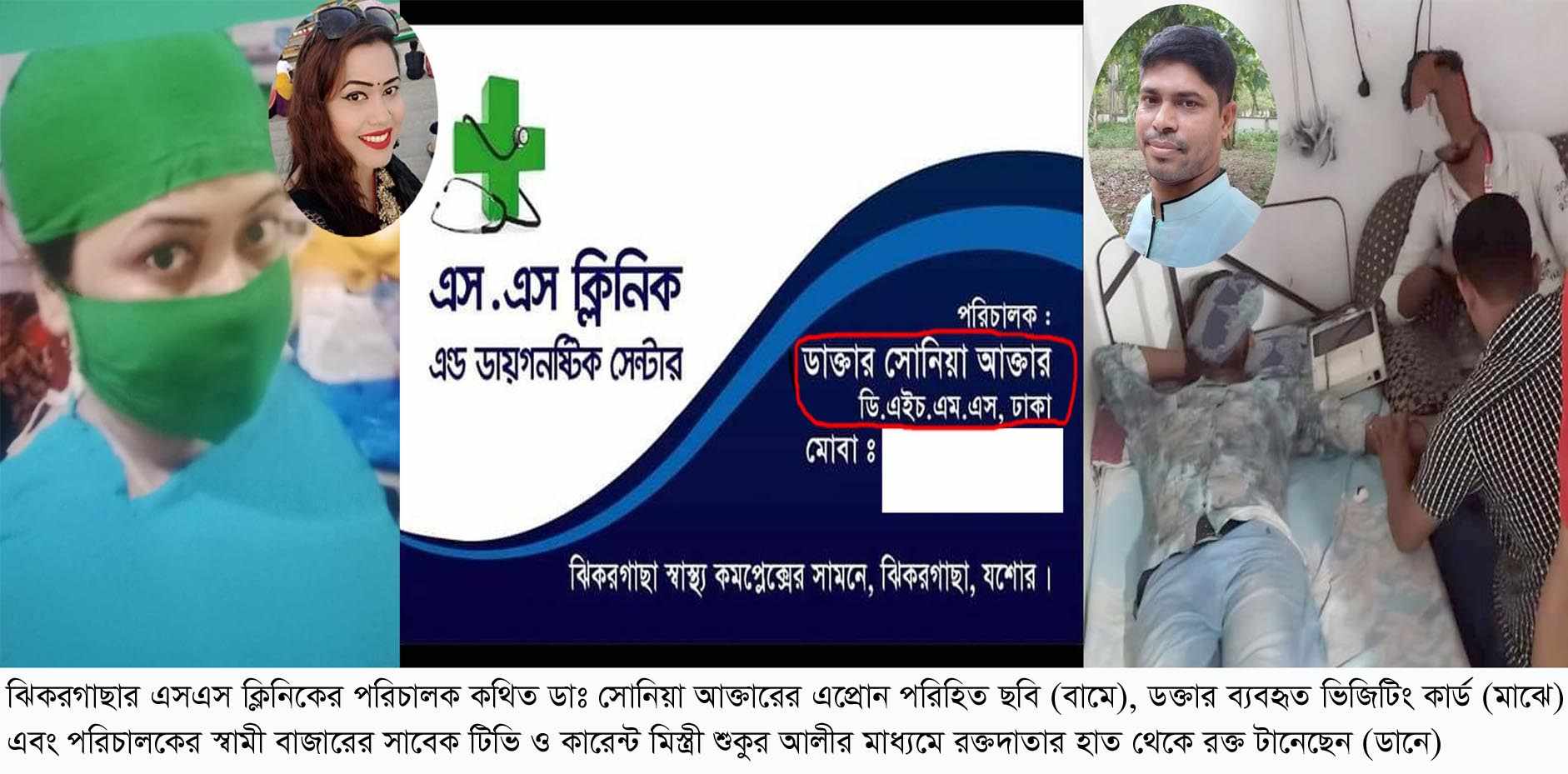 আফজাল হোসেন চাঁদ, ঝিকরগাছা : যশোরের ঝিকরগাছা পৌর সদরে উপজেলা স্বাস্থ্য কমপ্লেক্সের গেটের সামনে অবস্থিত অবস্থিত এসএস ক্লিনিক এন্ড ডায়াগনস্টিক সেন্টারের এ কেমন অপচিকিৎসার প্রতারণা শুরু হয়েছে ? ক্রমাগতই বেড়ে চলেছে অনিয়ম আর এই বিষয়ে প্রশাসনের দপ্তরে লিখিত অভিযোগ দিলেও প্রতিকার পাচ্ছে না কোন ভুক্তভোগী পরিবার। ক্লিনিকের মালিকের কর্মকান্ডের বিষয়ে কেউ মুখ খুলতে গেলে ধর্ষণ আর চাঁদাবাজির মামলা দেয়ার হুমকি পেতে হয় এমনকি নিস্তার পাই না এলাকার সংবাদকর্মীরাও! ঘটনার বিষয়ে ঠিকমত তদন্ত না করেই তার মুখের হাসির কাছে হার মেনে নিয়ে নির্বিকার সরকারি দপ্তরের প্রশাসন। ক্লিনিকের পরিচালক কথিত ডাঃ সোনিয়া আক্তার প্রকৃত ডিগ্রীধারী ডাক্তার না থাকলেও হোমিওপ্যাথিক ডিএইচএমএইচ ডিগ্রীর দৌলাতে তার ভিজিটিং কার্ডে ডাক্তার ব্যবহার করতে দেখা গেছে। এমনি তার স্বামী বাজারের টিভি ও কারেন্ট মিস্ত্রী শুকুর আলীর মাধ্যমে রক্তদাতার হাত থেকে রক্ত টানেন বলে অভিযোগ পাওয়া যায়। ক্লিনিকের পরিচালক কথিত ডাঃ সোনিয়া আক্তার মোবারাকপুর গ্রামের শামছুর রহমানের মেয়ে।