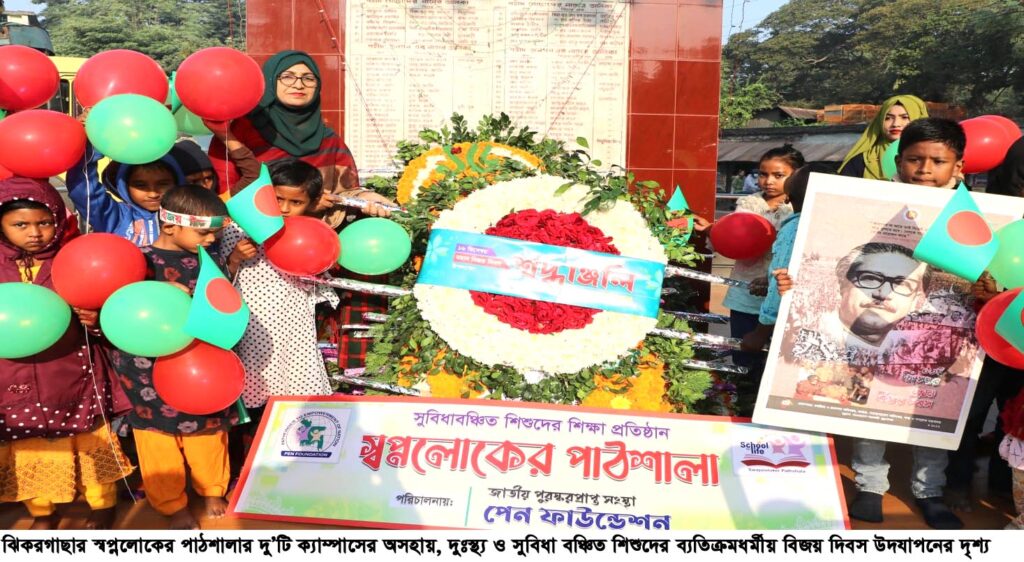 যশোরের ঝিকরগাছায় যথাযথ মর্যাদায় সুবিধা বঞ্চিত শিশুদের শিক্ষাপ্রতিষ্ঠান স্বপ্নলোকের পাঠশালার কোমলমতি শিক্ষার্থীদের অংশগ্রহণে উপজেলা মোড়ে শহীদদের স্মৃতি স্তম্ভে পূষ্পমার্ল্য অর্পণ করে ব্যতিক্রম উৎসবের মধ্যদিয়ে বিজয় দিবস উদযাপন করেছে। লাল-সবুজ পতাকা, নানান রঙের বেলুন-ফেষ্টুন ও বিজয় দিবস উপলক্ষে সরকার মুদ্রিত পোস্টার হাতে বিজয় স্তম্ভে একই ছন্দে একই তালে গুটি গুটি পায়ে হেটে পুস্প স্তবক অর্পণের চিত্র দেখে উপস্থিত সকলের নজর ও মন কাড়ে। জাতীয় পুরস্কারপ্রাপ্ত সংস্থা পেন ফাউন্ডেশন কর্তৃক পরিচালিত স্বপ্নলোকের পাঠশালার দু’টি ক্যাম্পাসের অসহায়, দুঃস্থ্য ও সুবিধা বঞ্চিত ৭০জন শিক্ষার্থীদের এই আয়োজনের নেতৃত্বদেন পেন ফাউন্ডেশনের নির্বাহী পরিচালক ও স্বপ্নলোকের পাঠশালার প্রতিষ্ঠাতা প্রধান শিক্ষক মেঘনা ইমদাদ। এসময় উপস্থিত ছিলেন পেন ফাউন্ডেশন ও স্বপ্নলোকের পাঠশালার শিক্ষক, কর্মকর্তা-কর্মচারীবৃন্দ।