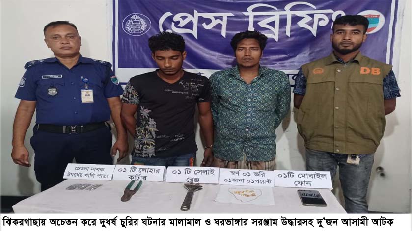 আফজাল হোসেন চাঁদ, ঝিকরগাছা : যশোরের ঝিকরগাছায় অচেতন করে দুধর্ষ চুরির ঘটনার মালামাল ও ঘরভাঙ্গার সরঞ্জাম উদ্ধার ও দু’জন আসামীকে আটক করেছেন জেলা গোয়েন্দা শাখার এলআইসি টিম। আটককৃত আসামীরা হলেন, সাতক্ষীরা জেলার কালীগঞ্জ থানার পশ্চিম পাইকাড়া গ্রামের আবুল হোসেন গাজীর ছেলে, বর্তমানে যশোর কোতয়ালী থানার পুলেরহাট মন্ডলগাতি আঃ মজিদে বাড়ীর ভাড়াটিয়া মোঃ রাজু গাজী (৩৫) ও সাতক্ষীরা জেলার কালীগঞ্জ থানার তেতুলিয়া পূর্বপাড়া গ্রামের মোঃ করিম বিশ্বাসের ছেলে মোঃ মিজানুর রহমান (২৫)।