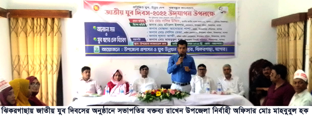 প্রশিক্ষিত যুব, উন্নত দেশ বঙ্গবন্ধুর বাংলাদেশ এই ¯েøাগানকে সামনে রেখে যশোরের ঝিকরগাছায় জাতীয় যুব দিবস পালিত হয়েছে। উপজেলা প্রশাসন ও উপজেলা যুব উন্নয়ন অধিদপ্তরের আয়োজনে মঙ্গলবার সকাল ১০টায় উপজেলা পরিষদ থেকে র্যালী শেষে অফিসার্স ক্লাবের হলরুমে আলোচনা সভা ও ২৬জন যুব সংগঠকদের মাঝে ১৩ লক্ষ ৩০হাজার টাকার যুব ঋণের চেক বিতরণ অনুষ্ঠিত হয়। অনুষ্ঠানে উপজেলা নির্বাহী অফিসার মোঃ মাহবুবুল হক’র সভাপতিত্বে ও উপজেলা যুব উন্নয়ন অফিসার মোঃ আরব আলীর স্বাগত বক্তব্যের মাধ্যমে অনুষ্ঠানে বিশেষ অতিথি ছিলেন, উপজেলা চেয়ারম্যান মোঃ মনিরুল ইসলাম, উপজেলা ভাইস চেয়ারম্যান মোঃ সেলিম রেজা, মহিলা ভাইস চেয়ারম্যান লুবনা তাক্ষী, উপজেলা সমাজসেবা অফিসার মেজবাহ উদ্দিন। এসময় উপস্থিত ছিলেন, পেন ফাউন্ডেশনের নির্বাহী পরিচালক মেঘনা ইমদাদ, সজন চক্রের নির্বাহী পরিচালক সুভাষ ভক্ত, যুব সংগঠনের আত্মকর্মী নাসরিন আক্তার, সোহেল হাওলাদার প্রমুখ। অনুষ্ঠানটি সঞ্চালনা করেন, জেডিও সংগঠনের নির্বাহী পরিচালক মনিরুজ্জামান মনির।