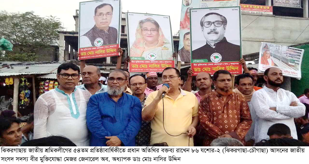 আফজাল হোসেন চাঁদ, ঝিকরগাছা : বাংলাদেশ আওয়ামী লীগের ভ্রাতৃপ্রতিম সংগঠন জাতীয় শ্রমিকলীগের ৫৪তম প্রতিষ্ঠাবার্ষিকী উপলক্ষে যশোরের ঝিকরগাছা উপজেলা শাখার উদ্যোগে বর্ণাঢ্য র্যালী ও আলোচনা সভা অনুষ্ঠিত হয়েছে। অনুষ্ঠানে প্রধান অতিথি ছিলেন ৮৬ যশোর-২ (ঝিকরগাছা-চৌগাছা) আসনের জাতীয় সংসদ সদস্য বীর মুক্তিযোদ্ধা মেজর জেনারেল অব. অধ্যাপক ডাঃ মোঃ নাসির উদ্দিন। এসময় তার বক্তব্যে বলেন, স্মার্ট বাংলাদেশ বিনির্মাণে মাননীয় প্রধানমন্ত্রী জননেত্রী শেখ হাসিনার ভূমিকা অপরিসীম। প্রধানমন্ত্রীর দূরদর্শী নেতৃত্বে এবং অগ্রগতিশীল উন্নয়ন কৌশল গ্রহণের ফলে বাংলাদেশ আজ বিশ্বে উন্নয়নের রোল মডেল। তিনি আরও বলেন, উন্নয়নের ধারাবাহিকতা বজায় রক্ষার্থে সবাইকে নৌকার পক্ষে কাজ করার আহ্বান জানাচ্ছি।