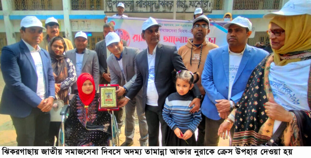 উপজেলা নির্বাহী অফিসার মোঃ মাহবুবুল হক’র সভাপতিত্বে ও উপজেলা সমাজসেবা অফিসার মেজবাহ উদ্দীনের স্বাগত বক্তব্যের মাধ্যমে অনুষ্ঠানে বিশেষ অতিথি ছিলেন, উপজেলা পরিষদের মহিলা ভাইস চেয়ারম্যান লুবনা তাক্ষী, উপজেলা পল্লী উন্নয়ন অফিসার মোঃ মাহমুদুল হাসান, সরকারি শিশু পরিবারের উপ তত্ত¡াবধায়ক আব্দুল কাদের, সহকারী মাধ্যমিক শিক্ষা অফিসার মোহাম্মদ সাহিদুল ইসলাম, সহকারী উপজেলা সমাজসেবা অফিসার সিরাজুল ইসলাম, অফিস সহকারী বাবুল আক্তার, অরাজনৈতিক সংগঠন সেবা’র সাংগঠনিক সম্পাদক সাংবাদিক আফজাল হোসেন চাঁদ, সদস্য শাহাবুদ্দীন মোড়ল, পেন ফাউন্ডেশনের নির্বাহী পরিচালক মেঘনা ইমদাদ সহ উপজেলার অন্তগত সমাজসেবা অধিদপ্তরের নিবন্ধনকৃত সকল প্রতিষ্ঠানের নেতৃবৃন্দ। অনুষ্ঠানটি পরিচালনা করেন, জেডিও সংগঠনের নির্বাহী পরিচালক মনিরুজ্জামান মনির। উল্লেখ্য, অনুষ্ঠানে পরিশেষে জন্ম থেকেই দুই হাত ও ডান পা নেই ঝিকরগাছার সেই অদম্য তামান্না আক্তার নুরা প্রাথমিক, মাধ্যমিক, উচ্চমাধ্যমিক পরীক্ষায় উত্তীর্ণের পর স্নাতক সম্মানের জন্য যশোর বিজ্ঞান ও প্রযুক্তি বিশ্ববিদ্যালয়ে (যবিপ্রবি) ইংরেজি বিভাগে ভর্তি হওয়ায় তাকে ক্রেস উপহার দেন উপজেলা প্রশাসন ও উপজেলা সমাজসেবা কার্যালয়।
