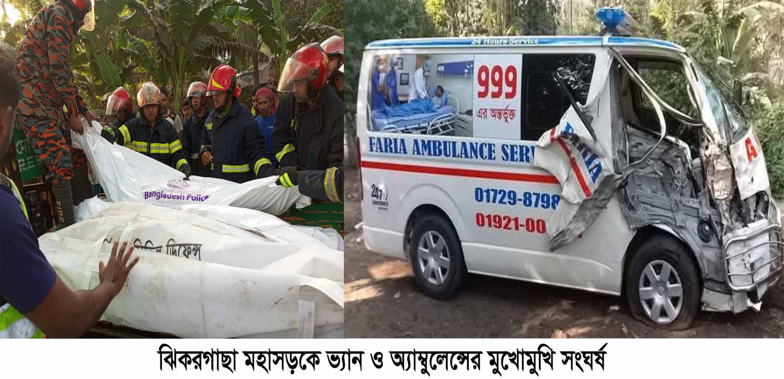 আফজাল হোসেন চাঁদ, ঝিকরগাছা : যশোরের ঝিকরগাছা উপজেলার গদখালীর নবীবনগর এলাকায় যশোর-বেনাপোল সড়কে ব্যাটারি চালিত ভ্যান ও অ্যাম্বুলেন্সের মুখোমুখি সংঘর্ষে ৩ জন নিহত ও ২জন আহত হয়েছে। বুধবার সকালে মহাসড়কে ভ্যান ও অ্যাম্বুলেন্সের মুখোমুখি সংঘর্ষে নিহতরা হল গদখালি গ্রামের জহুর আলীর স্ত্রী নাজমা খাতুন (৫০), বামন আলী গ্রামের হাসান ইকবালের মেয়ে রত্না খাতুন (১১), সৈয়দপাড়া গ্রামের জামাল সরদারের ছেলে মোহাম্মদ বাবলু (৫৫)। আহত অপর দুই ব্যক্তি গদখালি ইউনিয়নের বামন আলী গ্রামের এরশাদ আলীর ছেলে হাসান ইকবাল (৩৬) তার স্ত্রী হালিমা খাতুন (২৭)। নিহত শিশুরত্না খাতুন (১১) আহত হাসান ইকবাল ও হালিমা খাতুনের কন্যা। আহত ব্যক্তিদের অবস্থা আশঙ্কাজনক হওয়ায় যশোর সদর হাসপাতালে প্রেরণ করা হয়েছে। নিহত ৩ব্যক্তিরা ভ্যান আরোহী ছিলেন।