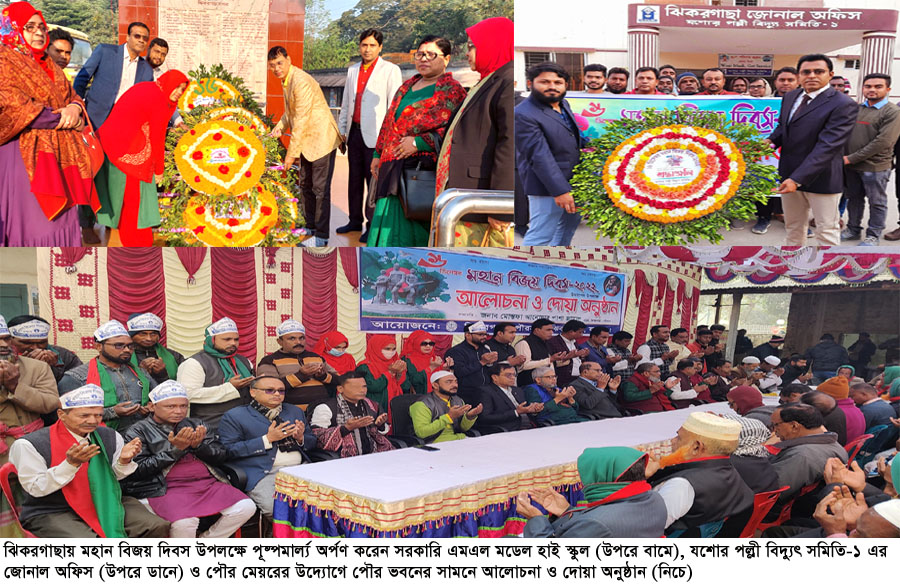 যশোরের ঝিকরগাছায় যথাযথ মর্যাদায় মহান বিজয় দিবস উপলক্ষে শুক্রবার (১৬ ডিসেম্বর) সকাল ৮টার সময় বিজয় দিবসের সূর্যদয়ের সাথে সাথে ঝিকরগাছা সরকারি এমএল মডেল হাই স্কুল, যশোর পল্লী বিদ্যুৎ সমিতি-১ এর ঝিকরগাছা জোনাল অফিস ও পৌরসভা কার্যালয়, সরকারি বেসরকারি স্বায়ত্বশাসিত ও বেসরকারি প্রতিষ্ঠানের পক্ষে উপজেলা মোড়ে শহীদদের স্মৃতি স্তম্ভে পূষ্পমার্ল্য অর্পণ করা হয়। এরপর সকল সরকারি বেসরকারি স্বায়ত্বশাসিত ও বেসরকারি ভবনে জাতীয় পতাকা উত্তোলন করা হয় এবং স্থানীয় বিএম হাই স্কুল মাঠে বীর মুক্তিযোদ্ধা ও শহীদ মুক্তিযোদ্ধা পরিবারের সংবর্ধনা, কুচকাওয়াজ, পৌরভার আয়োজনে আলোচনা সভা অনুষ্ঠিত হয়েছে। শহীদদের স্মৃতি স্তম্ভে পূষ্পমার্ল্য অর্পণের সময় উপস্থিত ছিলেন উপজেলা পরিষদের চেয়ারম্যান ও উপজেলা আওয়ামীলীগের যুগ্ম সাধারণ সম্পাদক মোঃ মনিরুল ইসলাম, উপজেলা আওয়ামীলীগের সহ-সভাপতি ও পৌর মেয়র আলহাজ্ব মোস্তফা আনোয়ার পাশা জামাল, উপজেলা পরিষদের ভাইস চেয়ারম্যান মোঃ সেলিম রেজা, মহিলা ভাইস চেয়ারম্যান লুবনা তাক্ষী, ঝিকরগাছা সরকারি এমএল মডেল হাই স্কুলের প্রধান শিক্ষক মোঃ মোস্তাফিজুর রহমান আজাদ, সহকারী প্রধান শিক্ষক এএফএম সাজ্জাদুল আলম, যশোর পল্লী বিদ্যুৎ সমিতি-১ এর ঝিকরগাছা জোনাল অফিসের ডিজিএম টিএম মেসবাহ উদ্দিন, এজিএম মোঃ রুবেল রানা, এমএসসি এসএম জাহিদুল ইসলাম সহ আরো অনেক।