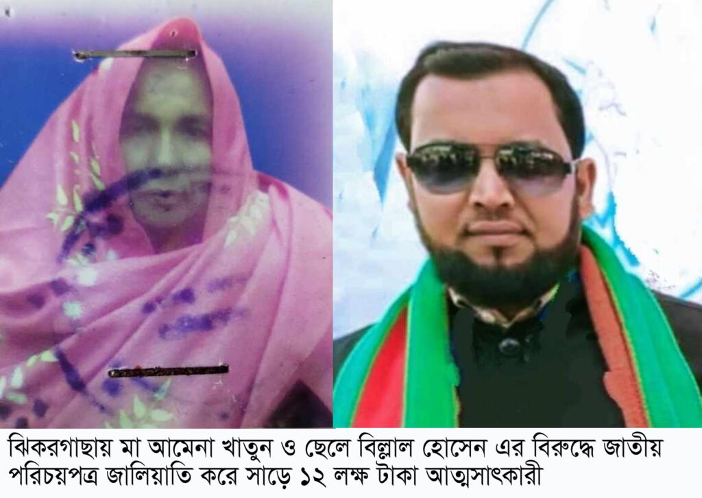 আফজাল হোসেন চাঁদ, ঝিকরগাছা : যশোরের ঝিকরগাছা উপজেলার পানিসারা ইউনিয়নের কুলিয়া গ্রামের মা ও ছেলের বিরুদ্ধে জাতীয় পরিচয়পত্র জালিয়াতি করে সাড়ে ১২ লক্ষ টাকা আত্মসাৎের অভিযোগ উঠেছে। অভিযুক্ত মা হলেন মৃত মোরশেদ আলীর স্ত্রী আমেনা খাতুন ও ছেলে বিল্লাল হোসেন। এই কর্মকান্ড পরিচালনা করে বিল্লাল হোসেন নিজের জাতীয় পরিচয়পত্র জালিয়াতি করে আমেনা খাতুনের ব্যাংক একাউন্টের নমিনি হয়েছেন।