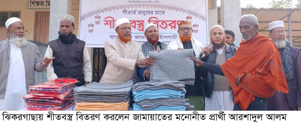 আফজাল হোসেন চাঁদ, ঝিকরগাছা : যশোরের ঝিকরগাছায় শীতবস্ত্র বিতরণ করলেন যশোর-২ (চৌগাছা- ঝিকরগাছা) আসনের জামায়াতের মনোনীত প্রার্থী অধ্যাপক মাওলানা আরশাদুল আলম। বাংলাদেশ জামায়াতে ইসলামী ঝিকরগাছা উপজেলা শাখার উদ্যোগে শীতার্তদের মাঝে ৫০০টি কম্বল ও ২৫০টি চাদর বিতরণ করেছেন। মঙ্গলবার (২৪ডিসেম্বর) বিকালে ঝিকরগাছা দারুল উলুম কামিল মাদ্রাসা প্রাঙ্গণে আয়োজিত বস্ত্র বিতরণ অনুষ্ঠানের সভাপতিত্ব করেন, উপজেলা জামায়াতে আমির মাওলানা আব্দুল আলিম। এসময় উপস্থিত ছিলেন,বাংলাদেশ জামায়াতে ইসলামী জেলা কর্মপরিষদ সদস্য অধ্যাপক জয়নাল আবেদীন, উপজেলা নায়েবে আমির অধ্যাপক হারুন অর রশিদ, সেক্রেটারী নজরুল ইসলাম খান, উপজেলা এ্যাসিস্ট্যান্ট সেক্রেটারি মাস্টার শেখ আব্দুর রকিম, মাওলানা ইমদাদুল হক, আব্দুল হামিদ সহ অন্যান্য নেতৃবৃন্দ