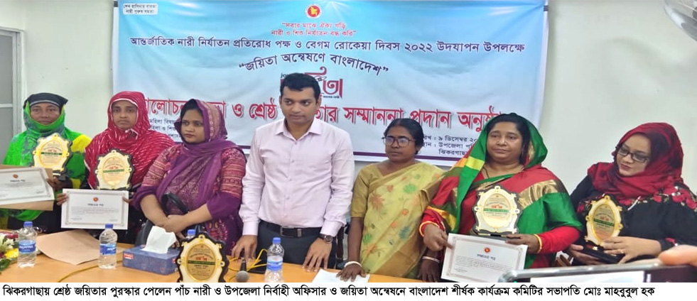 যশোরের ঝিকরগাছা উপজেলা প্রশাসনের আয়োজনে ও মহিলা বিষয়ক অধিদপ্তরের সার্বিক তত্ত¡াবধানে বেগম রেকেয়া দিবসে উপজেলার মধ্যে পাঁচ ক্যাটাগরীতে শ্রেষ্ঠ জয়িতা পুরস্কার পেলেন পাঁচজন নারী। অর্থনৈতিকভাবে সাফল্য অর্জনকারী নারীর ক্যাটাগরীতে শ্রেষ্ঠ জয়িতা হয়েছেন, পৌরসদরের কৃষ্ণনগর গ্রামের বাংলাদেশ আওয়ামী যুবলীগের ঝিকরগাছা উপজেলা শাখার আহবায়ক কমিটির যুগ্ম আহবায়ক মোঃ ইলিয়াস হোসেনে ওরফে ইলিয়াজ মাহমুদের সহধর্মিনী মেফতাহুল জান্নাত, শিক্ষা ও চাকুরীক্ষেত্রে সাফল্য অর্জনকারী নারীর ক্যাটাগরীতে শ্রেষ্ঠ জয়িতা হয়েছেন, পৌরসদরের পুরন্দরপুর গ্রামের শাহাজান আলীর সহধর্মিনী জোছনা খাতুন, সফল জননী নারীর ক্যাটাগরীতে শ্রেষ্ঠ জয়িতা হয়েছেন, গদখালী ইউনিয়নের বারবাকপুর গ্রামের আব্দুল খাঁ এর সহধর্মিনী আনোয়ারা বেগম, নির্যাতনের বিভীষিকা মুছে ফেলে নতুন উদ্যমে জীবন শুরু করেছেন যে নারীর ক্যাটাগরীতে শ্রেষ্ঠ জয়িতা হয়েছেন, পানিসার ইউনিয়নের সৈয়েদপাড়া গ্রামের দবির উদ্দীনের মেয়ে পারুল খাতুন এবং সমাজ উন্নয়নে অসামান্য আবদান রেখেছেন যে নারীর ক্যাটাগরীতে শ্রেষ্ঠ জয়িতা হয়েছেন, সদর ইউনিয়নের আকবর আলীর সহধর্মিনী মাফরুহা আকবর শিল্পী।