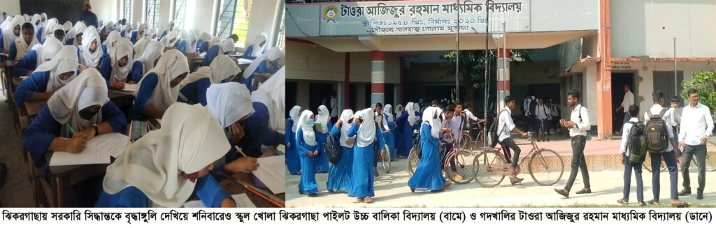 অপরদিকে গদখালি টাওরা আজিজুর রহমান মাধ্যমিক বিদ্যালয়ে সকাল ১১ টায় গিয়ে দেখা যায়, ৬ষ্ঠ-১০ম শ্রেণির সকল শিক্ষার্থী স্কুল ড্রেস পরে ক্লাস করছে। কয়েকজন শিক্ষার্থী অভিযোগ করে বলেন, প্রতি সপ্তাহে এভাবে আমাদেরকে স্কুলে আসতে বাধ্য করা হয়। না আসলে স্যারেরা খুব বকাবকি করে। আমরা ছুটির দিনে ছুটি চাই।