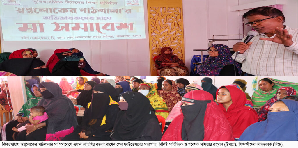 যশোরের ঝিকরগাছার পেন ফাউন্ডেশন কর্তৃক পরিচালিত সুবিধা বঞ্চিত শিশুদের শিক্ষাপ্রতিষ্ঠান স্বপ্নলোকের পাঠশালার অভিভাবকদের নিয়ে মা সমাবেশ করা হয়েছে। শনিবার সকালে পেন ফাউন্ডেশন প্রধান কার্যালয়ে স্বপ্নলোকের পাঠশালার ০২টি ক্যাম্পাসের ৭০জন শিক্ষার্থীদের অভিভাবকের নিয়ে মা সমাবেশে প্রধান অতিথি ছিলেন পেন ফাউন্ডেশনের সভাপতি, বিশিষ্ট সাহিত্যিক ও গবেষক সফিয়ার রহমান। পেন ফাউন্ডেশনের নির্বাহী পরিচালক ও স্বপ্নলোকের পাঠশালা’র প্রতিষ্ঠাতা প্রধান শিক্ষক মেঘনা ইমদাদ এর সভাপতিত্বে উপস্থিত ছিলেন পেন ফাউন্ডেশনের স্বেচ্ছাসেবক টিম লিডার প্রেসিডেন্টস অ্যাওয়ার্ড প্রাপ্ত রোভার স্কাউট জুবায়ের বিন মকলেছ, স্বপ্নলোকের পাঠশালা’র রতœা ইসলাম ও শিক্ষক বিথী খাতুন, পেন ফাউন্ডেশনের প্রোগ্রাম ম্যানেজার মায়মুনা সুলতানা একা সহ আরও অনেকে। উল্লেখ্য, উক্ত মা সমাবেশ আসন্ন অনুষ্ঠিতব্য চুড়ান্ত পরীক্ষা, বার্ষিক বনভোজন, ১৬ ডিসেম্বর মহান বিজয় দিবস ও মেডিকেল ক্যাম্প প্রস্তুতিমূলক বিষয়ে আলোচনা করা হয়।
