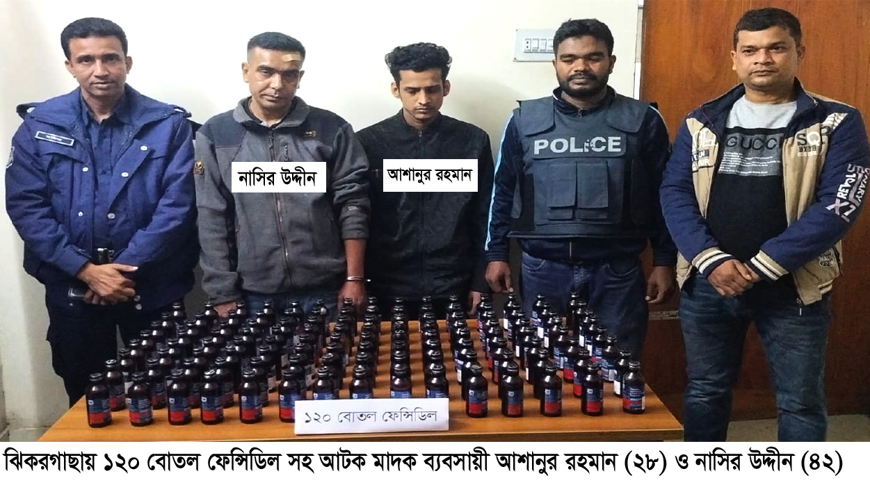 যশোরের ঝিকরগাছা থানা পুলিশের বিশেষ অভিযানে ১২০ বোতল ফেন্সিডিল সহ দুই মাদক ব্যবসায়ীকে আটক হয়েছে। আটককৃতরা হল- বেনাপোলপোর্ট থানার ভবেরবেড় গ্রামের বখতিয়ার রহমানের ছেলে মোঃ আশানুর রহমান (২৮) ও মৃত নুর হোসেনের ছেলে মোঃ নাসির উদ্দীন (৪২)। পুলিশ সূত্রে জানা যায়, থানা এলাকায় অভিযান ডিউটি করাকালীন সময়ে গোপন সংবাদের ভিত্তিতে সোমবার (২৫ ডিসেম্বর ) সাড়ে ৪টার দিকে থানার মোড় সংলগ্ন পারবাজার নামক স্থানের যশোর-বেনাপোল মহাসড়কের উপর বেনাপোল হতে ছেড়ে আসা ঢাকা গামী লিটন ট্রাভেলস (পরিবহন) থাকা দুই যাত্রীর নিকট হতে ১২০ বোতল ফেনসিডিলসহ আটক করেন। এ বিষয়ে থানায় মামলা নং ২২, তারিখ ২৫/১২/২০২৩ইং। থানার নবাগত অফিসার ইনচার্জ কামাল হোসেন ভূঁইয়া জানান, তাদের বিরুদ্ধে রাতে থানায় মাদকদ্রব্য নিয়ন্ত্রণ আইনে মামলা হয়েছে। আসামীদ্বয়কে মঙ্গলবার (২৬ ডিসেম্বর ) বিজ্ঞ আদালতে প্রেরণ করা হয়েছে।