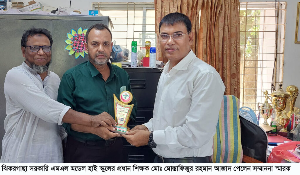 যশোরের ঝিকরগাছা সরকারি এমএল মডেল হাই স্কুলের প্রধান শিক্ষক ও বাংলাদেশ স্কাউটস খুলনা অঞ্চলের ইউনিট লিডার মোঃ মোস্তাফিজুর রহমান আজাদ প্রেসিডেন্ট’স স্কাউট অ্যাওয়ার্ড অর্জনে সহায়তা প্রদান করায় পেলেন সম্মাননা স্মারক। ঝিকরগাছা সরকারি এমএল মডেল হাই স্কুলের প্রধান শিক্ষকের রুমে এই সম্মাননা স্মারক তুলে দেন কৃষ্ণনগর মডেল সরকারি প্রাথমিক বিদ্যালয়ের প্রধান শিক্ষক ও বাংলাদেশ স্কাউটস ঝিকরগাছা উপজেলার ক্যাম্পুরী চিপ কমিশনার এসএম আকিফুজ্জামান, সহকারী শিক্ষক ও ডেপুটি ক্যাম্পুরী টিফ মোঃ আব্দুর রশিদ (এএলটি)। এ বিষয়ে ঝিকরগাছা সরকারি এমএল মডেল হাই স্কুলের প্রধান শিক্ষক মোঃ মোস্তাফিজুর রহমান আজাদ বলেন, কখনো কারও একার পক্ষে কোন কিছু অর্জন করা সম্ভব হয় না। আমার কোমলমতি শিশু সন্তানদের সাফল্যের চাকিকাঠি মাধ্যমে আমার এই প্রাপ্তি। আমার এই প্রাপ্তিটা আমি আমার সকল কোমলমতি শিশু সন্তানদের প্রতি উৎসর্গ করলাম। আমি দোয়া করি আমার কোমলমতি শিশু সন্তানরা সর্বদা সুস্থ্য ও ভালো থাকুক।