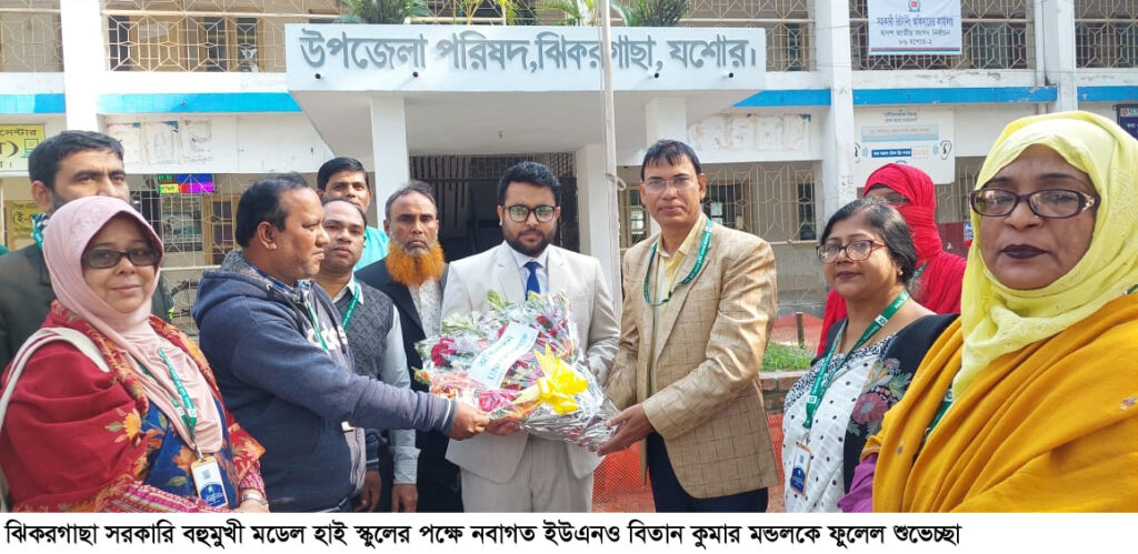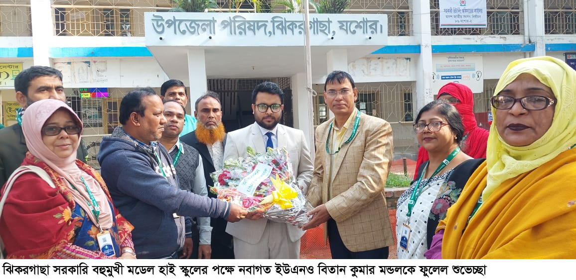 যশোরের ঐতিহ্যবাহী ঝিকরগাছা সরকারি বহুমুখী (এম.এল) মডেল হাই স্কুলের পক্ষ হতে উপজেলা নির্বাহী অফিসার (ইউএনও) ও ঝিকরগাছা সরকারি বহুমুখী (এম.এল) মডেল হাই স্কুলের নবাগত সভাপতি বিতান কুমার মন্ডলকে ফুলেল শুভেচ্ছা জ্ঞাপন করেছেন প্রধান শিক্ষক মোঃ মোস্তাফিজুর রহমান আজাদ। উপজেলা পরিষদের সামনের এই শুভেচ্ছা জ্ঞাপন অনুষ্ঠানে আরও উপস্থিত ছিলেন, সহকারী প্রধান শিক্ষক এএফএম সাজ্জাদুল আলম, সহকারী শিক্ষক আফরোজ খানম চায়না, রাজিয়া সুলতানা, সুমা কর্মকার, শবনাম পারভিন, স্বপন কুমার ঘোষ, সিরাজুল ইসলাম, ট্রেড ইন্স্ট্রাক্টর দেবাশীষ বিশ্বাস, শাকিলা খাতুন সহ স্কুলের অন্যান্য শিক্ষকবৃন্দ।