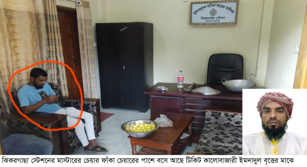 ঝিকরগাছা রেলওয়ে স্টেশনে কর্মরত কর্মকর্তা-কর্মচারীদের সহযোগিতায় স্টেশন ক্যাম্পাসে ইমদাদুল আবারও আনাগোনা পাওয়া যাচ্ছে। বৃহস্পতিবার বেলা সাড়ে ১১টার সময় রেলওয়ে স্টেশনের স্টেশন মাস্টারকে খুঁজে পাওয়া না গেলেও ইমদাদুলকে মাস্টারের চেয়ারের পাশে বসে থাকতে দেখা গেছে। বাংলাদেশ রেলওয়ে সংস্থার পশ্চিমাঞ্চল কতৃক পরিচালিত ঝিকরগাছা রেলওয়ে স্টেশনে স্টপেজের দাবিতে ও অত্যাধুনিক রেক বদলে পুরোনো রেক দিয়ে চালু করার প্রতিবাদে স্থানীয় অরাজনৈতিক স্বেচ্ছাসেবী সংগঠন সেবা’র উদ্যোগে যশোর জেলার সর্বস্তরের মানুষ তার প্রতিবাদে রেলওয়ে স্টেশনে মানববন্ধন করেন। স্টপেজের দাবিতে মানববন্ধন করা হলে রেলওয়ে কর্তৃপক্ষ দাবিটাকে আমলে নিয়ে ঝিকরগাছা রেলওয়ে স্টেশনে স্টপেজের ব্যবস্থা সহ ৫৫টি সিট বরাদ্দ দেয়। পরবর্তীতে করোনার পর সিট সংখ্যা কমিয়ে ৪০টি করা হয়, যার ২০টি অনলাইন এবং ২০টি স্টেশন থেকে সরবরাহ করা হয়। ট্রেনে মাত্র ২০টি সিট বরাদ্দ থাকায় এই টিকেট পাওয়ার জন্য এতদাঞ্চলের মানুষ আরামদায়ক ভ্রমনের আশায় প্রতিযোগিতায় লিপ্ত হয়। আর এই সুযোগটিই গ্রহন করেছে একটি অসাধু চক্র। তারা খুব কৌশলে ট্রেনের টিকেট গুলো নিজেরা সংগ্রহ করে নেয় এবং সুযোগ বুঝে যাত্রীদের কাছে ২গুন থেকে ৩গুন দামে বিক্রয় করা সেই ইমদাদুল আবারও আনাগোনা পাওয়া যাচ্ছে ঝিকরগাছা রেলওয়ে স্টেশনে। পূর্বে যখন ইমদাদুলের নিকট জানতে চাওয়া হলে তিনি কে, তিনি রেলওয়ে স্টেশনে কি করছে এবং তিনি রেল স্টেশনের সরকারি কোন কর্মকর্তা কি না জানতে চাওয়া হলে, সে জানায় টিকেট বুকিং সহকারী মেহেদী হাসান জেমস তাকে ব্যক্তিগতভাবে নিয়োগ দিয়েছে। যার জন্য সে রেলওয়ে স্টেশন তদারকির দায়িত্ব পালন করছে। তিনি সরকারের কোনো কর্মচারী নন, নেই কোনো নিয়োগপত্র, রেলওয়ে দপ্তরের সাথে কোনো সম্পর্ক নেই, পেশায় ছিলেন দর্জি অথচ এখন তার হাতে রেলওয়ে স্টেশনের চাবি থাকে। ইমদাদুলের নিকট থেকে শুনতে অবাক লাগলো তার বেতন দেয় টিকিট বুকিং সহকারী নিজে। টিকিট বুকিং সহকারী মেহেদী হাসান জেমস কর্তৃক নিয়োগপ্রাপ্ত হওয়ার পরই তার কপাল খুলে গেছে। সে রেলওয়ে স্টেশনের দায়িত্বপ্রাপ্ত হওয়ার কারণে তার কাছে রেলওয়ে স্টেশনের সকল চাবিকাঠি থাকে। এই বিষয় নিয়ে জাতীয়, স্থানীয় দৈনিক পত্রিকা ও অনলাইন প্রিন্ট মিডিয়াতে এই স্টেশন নিয়ে একাধিকবার সংবাদ প্রকাশ হওয়ায় গত ১ জুন বিভাগীয় রেলওয়ে কর্মকর্তা (পশ্চিমাঞ্চল) স্বাক্ষরিত একটি দাপ্তরিক চিঠির মাধ্যমে রেলওয়ে স্টেশনের টিকিট বুকিং সহকারী মেহেদী হাসান জেমসকে রাজশাহী বিভাগের চাপাইনবাবগঞ্জ জেলার রহনপুর স্টেশনে বদলি করেছে রেল মন্ত্রণালয়। তখন রেলওয়ে স্টেশনের মাস্টার নিগার সুলতানা ম
