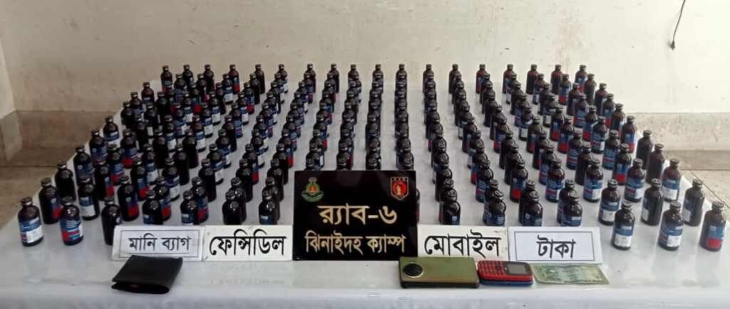 ১৭ নভেম্বর ২০২৪ ইং র্যাব-৬, সিপিসি-২, ঝিনাইদহ ক্যাম্পের একটি আভিযানিক দল গোপন সংবাদের মাধ্যমে তথ্য প্রাপ্ত হয় যে, কতিপয় মাদক ব্যবসায়ী মটর সাইকেল যোগে মাদক বহন করে মহেশপুর থেকে ঝিনাইদহ সদর এর দিকে যাচ্ছে। উক্ত সংবাদ প্রাপ্ত হয়ে আনুমানিক সকাল ০৯:৩০ ঘটিকায় ঝিনাইদহ জেলার মহেশপুর থানাধীন ০১নং এস.বি.কে খালিশপুর ইউনিয়নের বজরাপুর গ্রামস্থ রাজা বাদশা স্যানেটারি এন্ড কুটি হাউজ এর সামনে খালিশপুর টু কোটচাঁদপুর হাইওয়ে রাস্তার উপর চেকপোষ্ট পরিচালনা করাকালীন দ্রুত গতিতে ০১ টি মটর সাইকেল আসতে দেখে থামানোর সংকেত দিলে সংকেত অমান্য করে মোটরসাইকেলের চালক দ্রুত গতিতে পালিয়ে যাবার সময় মোটর সাইকেলে বসা চালকসহ ০৩ জন মাদক ব্যবসায়ী – ১। মোঃ ইমামুল হোসেননয়ন (২০), পিতা- অমিদুল ইসলাম, সাং- নাটিমা, থানা- মহেশপুর, জেলা- ঝিনাইদহ, ২। মোঃ ডালিবুর বিশ্বাস রানা (৩৪), পিতা- মোঃ আমজাদ বিশ্বাস, ৩ । মোঃ রাসেল (১৯), পিতা- সাইফুল বিশ্বাস, উভয় সাং- মেদিনীপুর, থানা- জীবননগর, জেলা- চুয়াডাঙ্গাকে গ্রেফতার করা হয় এবং তাদের হেফাজত হতে অবৈধ ভারতীয় ফেন্সিডিল-১৯০ বোতল, ০১টি মোটরসাইকেল, ০৪টি মোবাইল ফোন, নগদ – ৫০০/- টাকা উদ্ধারপূর্বক জব্দ করা হয়।